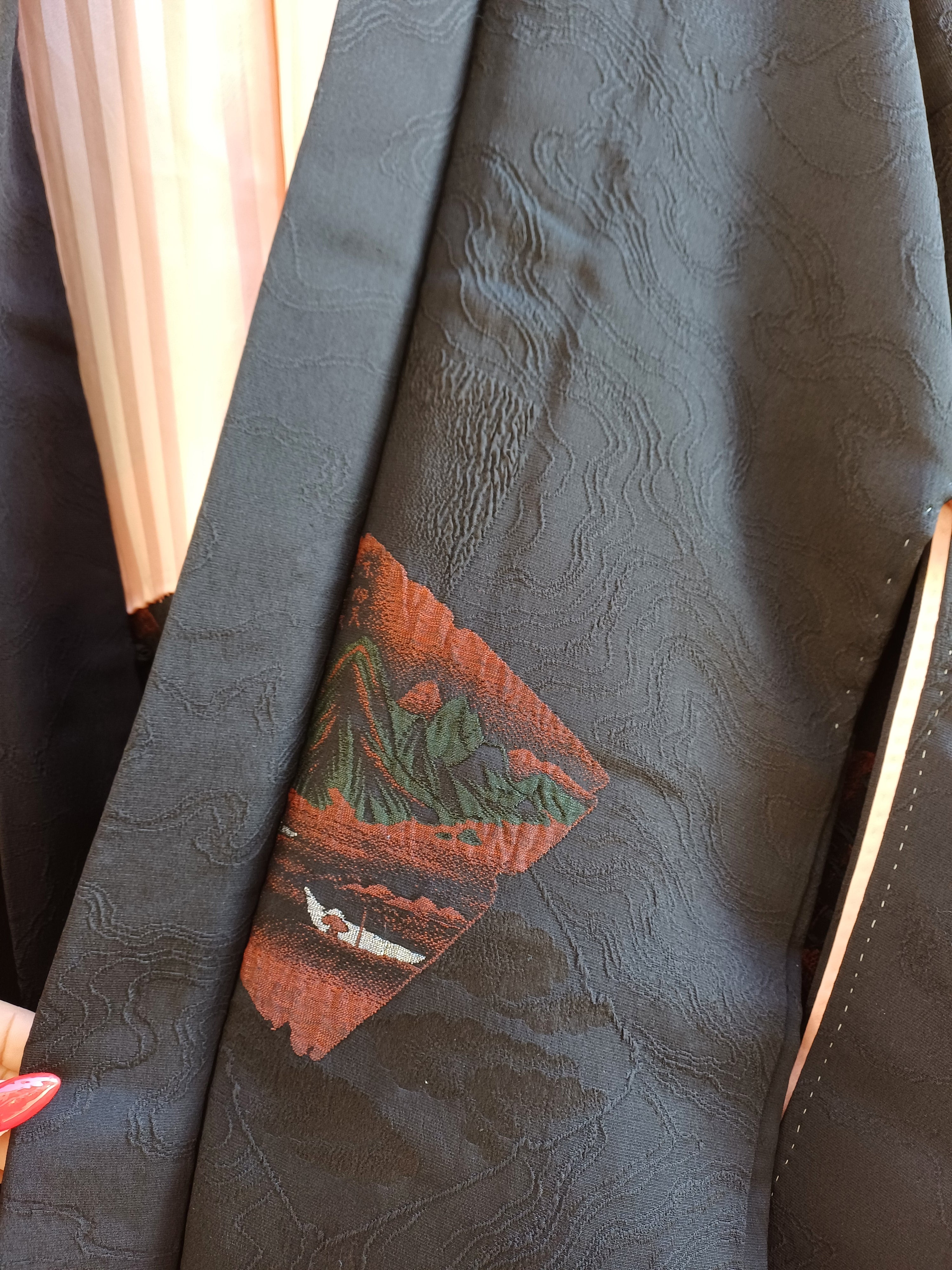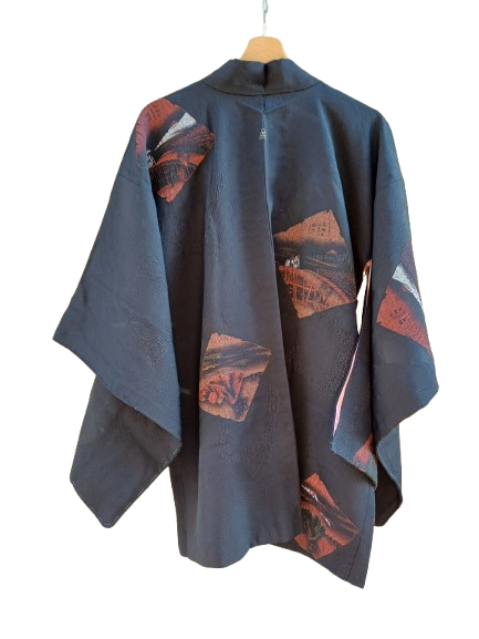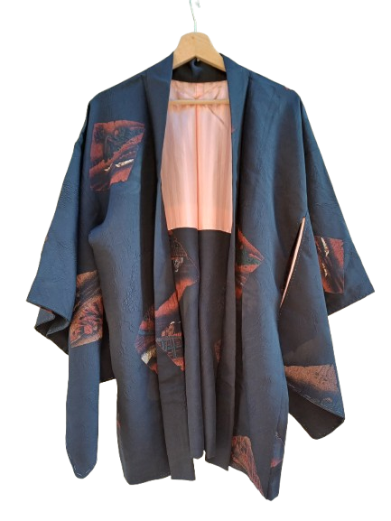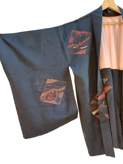 Splettacoare contrasto tra la stoffa salmone dentro e i disegni boreale su fondo nero del fuori, haori sartoriale giappo, con l'utilizzo di sete pregiate vintage