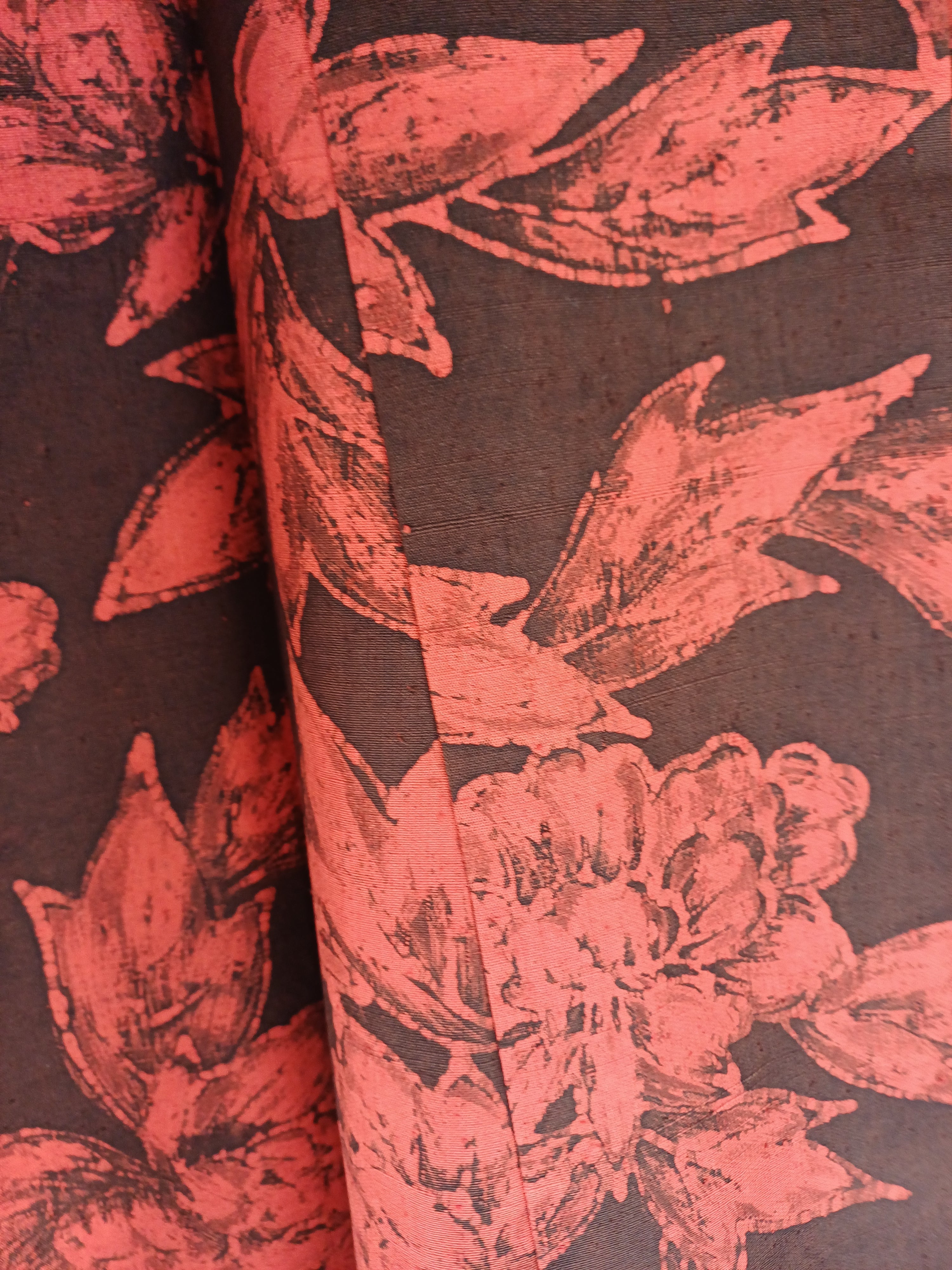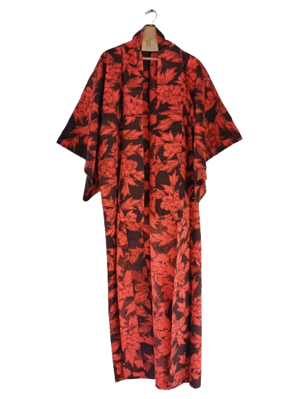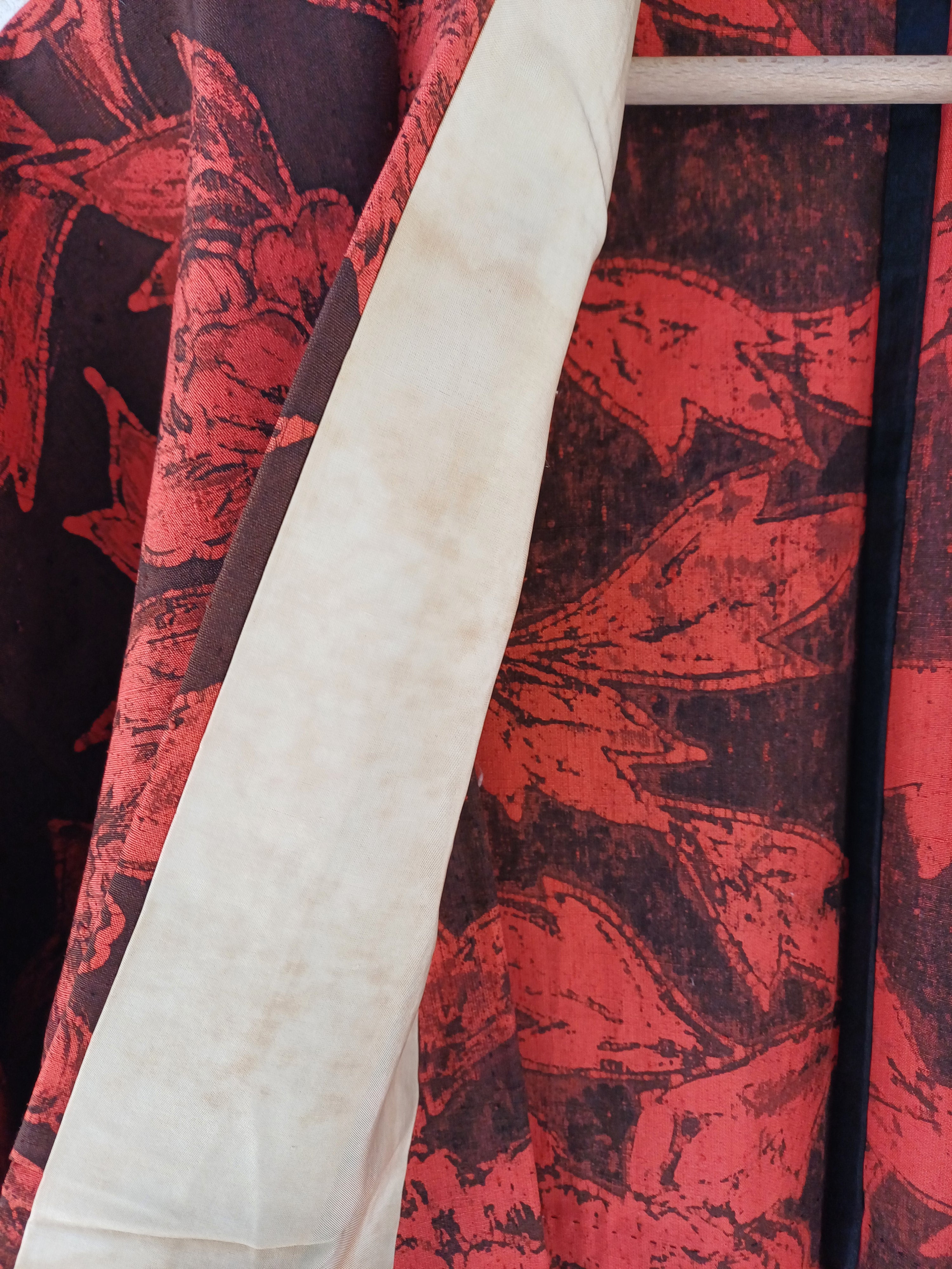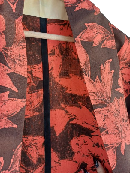 Kimono in seta con tessuti vintage originali giapponesi, unisex tema fiori Corallo su mattone caldo, 100% seta cruda  fatto interamente a mano con cuciture interne ribattuto, presenta segni del tempo sulla fodera ma tutto ciò conferisce una vibrazione ancora più draculesca