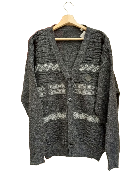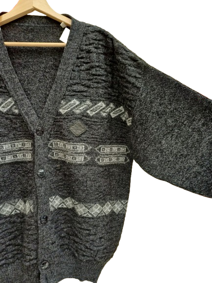 Cardigan anni 90 in misto lana, con rombetti in pelle, scollo v e costumino a stringere, bottoni simil pelle, fantasia Geometrica, giro sceso e fit ampio