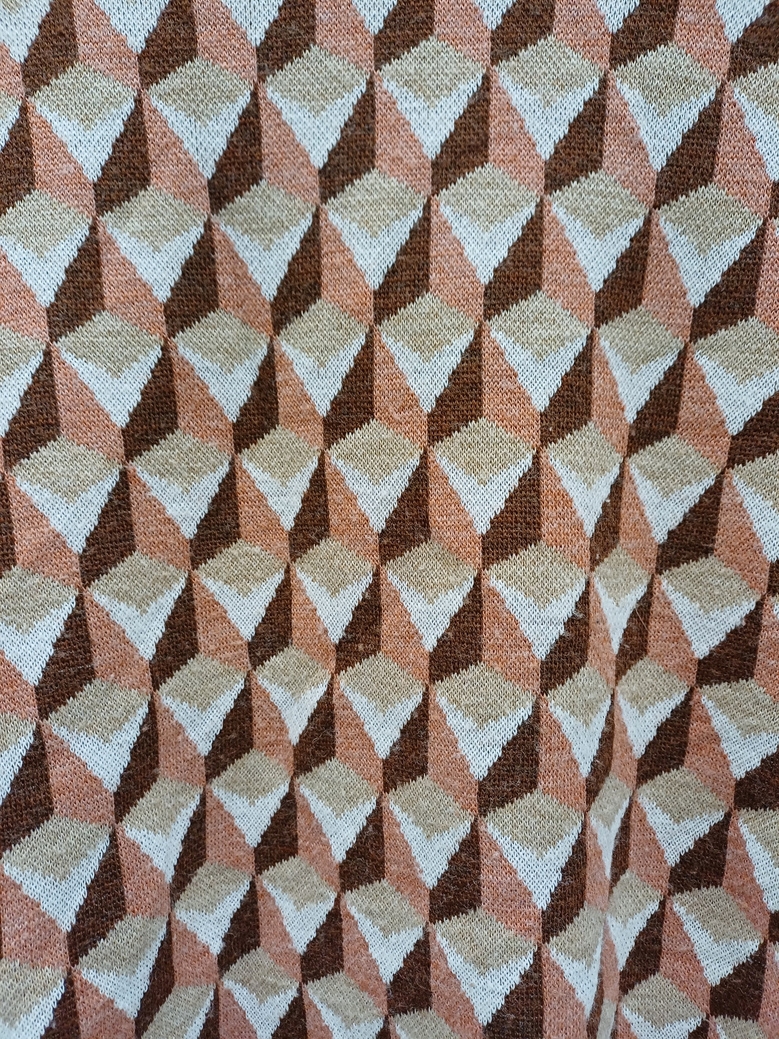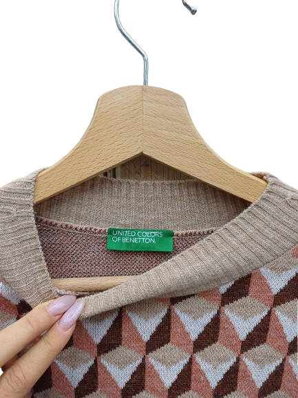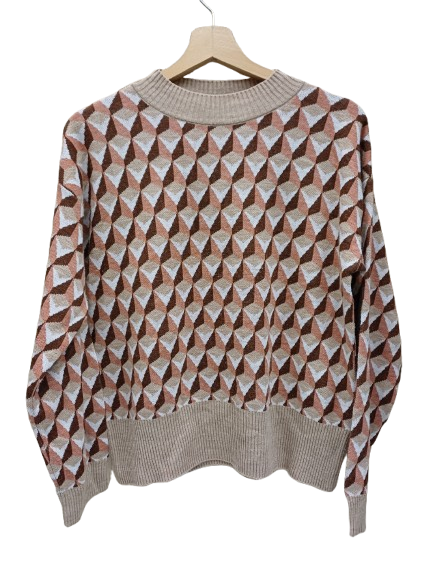 Maglia anni 00 viscosa e acrilico, fantasia geometrica sui toni del cipria, nocciola e panna , costurini alti e girocollo , un pezzo casual e classico dal sapore pradiano da abbinare a mini e pantaloni , veste m