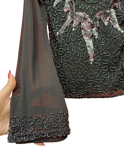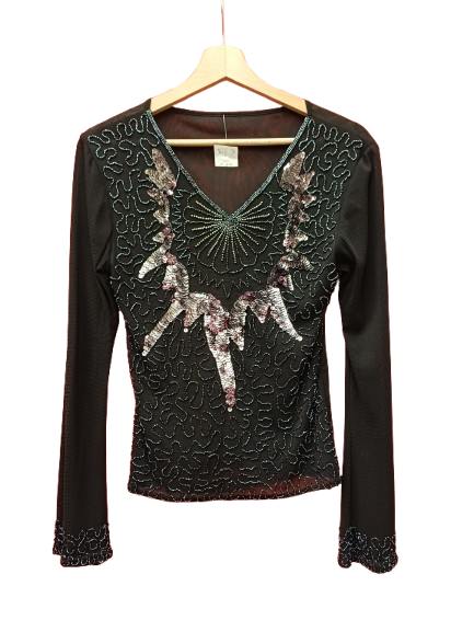 Maglia elasticizzata in tulle doppio davanti con applicazioni tema liberty, taglia s, bellissima su gonne eleganti, jeans a vita bassa stile bratz