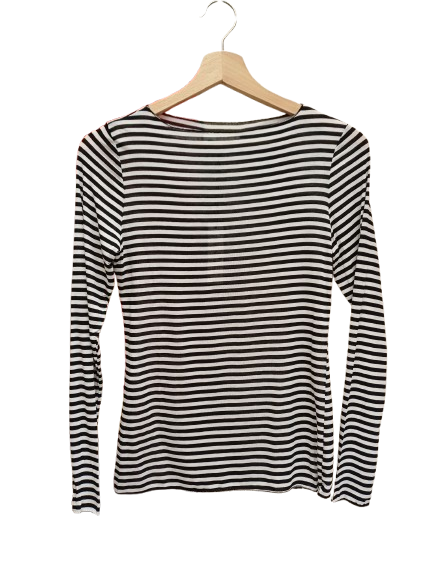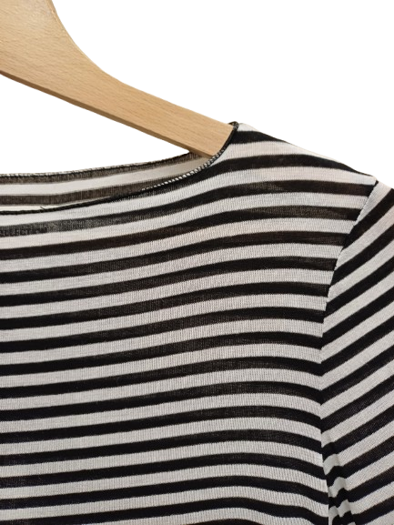 Delicatissima maglietta manica lunga, scollo piatto taglio vivo, semitrasparente, un capo basic molto 90s da utilizzare sotto i maglioni per non sentire il pizzichio oppure sopra gonne affusolata senza reggiseno per un effetto kate moss, elasticizzata veste fino la 46