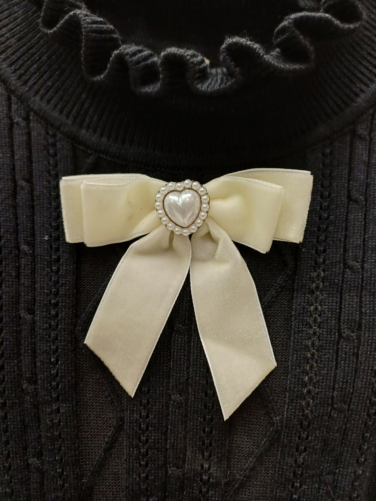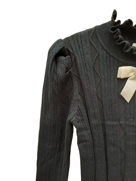 Maglia musto viscosa, aderente, mezzo collo, manica lunga a palloncino, elasticizzata con trama lavorata, dettaglio prezioso e ironico al collo in contrasto fiocco bianco di velluto con cuore e perline