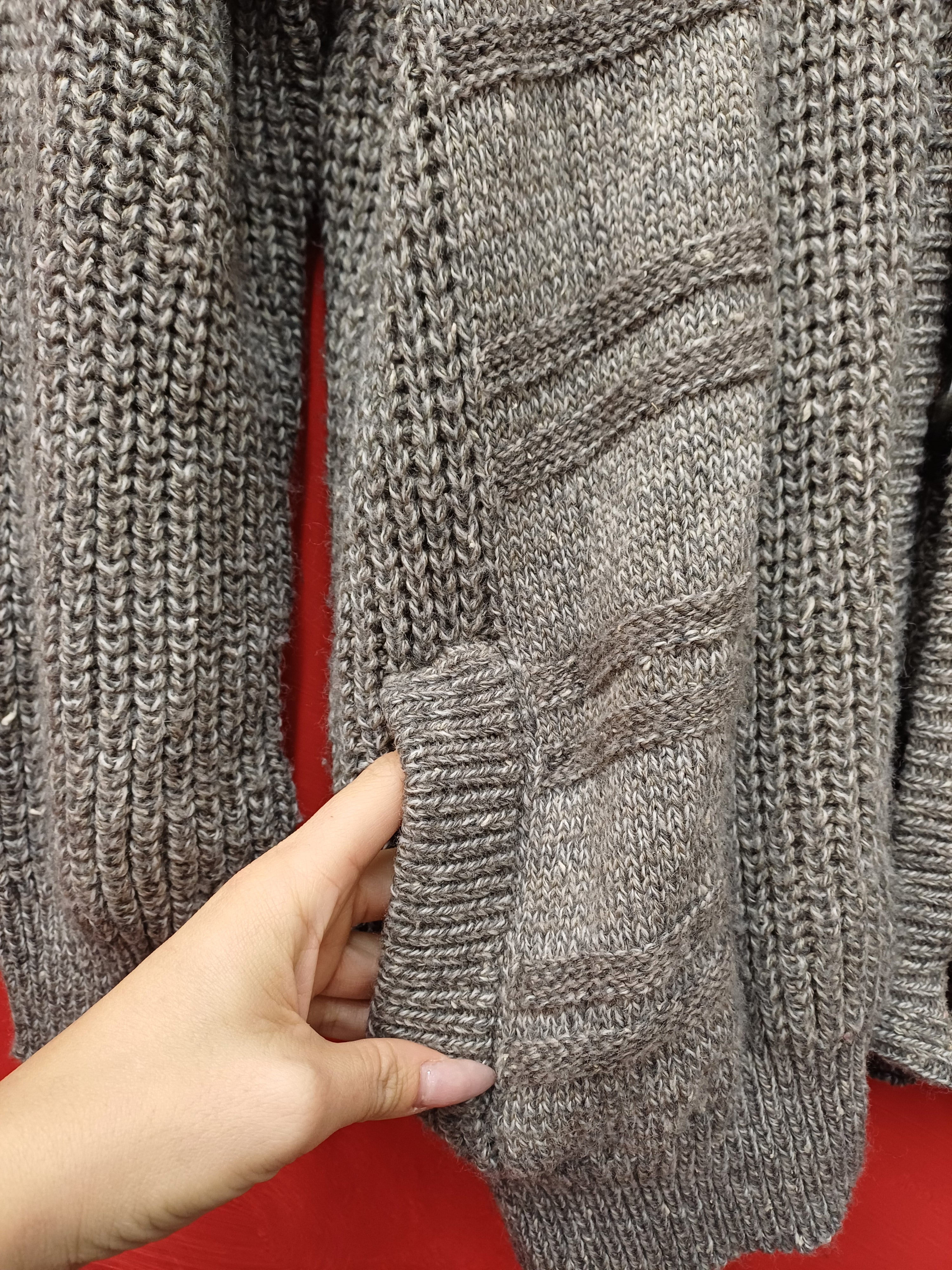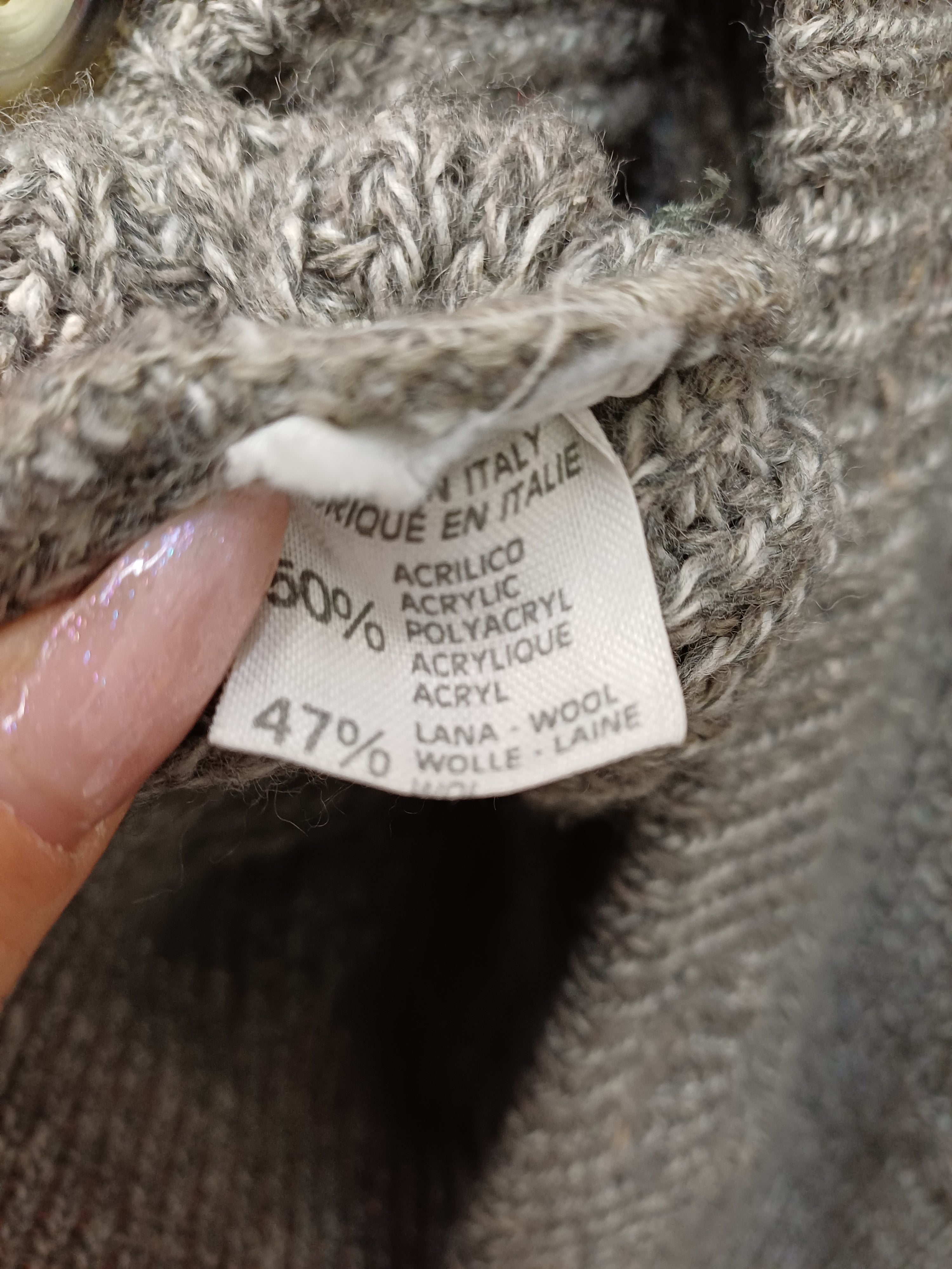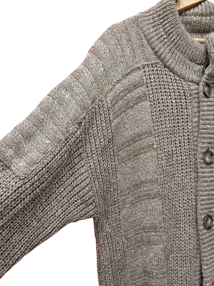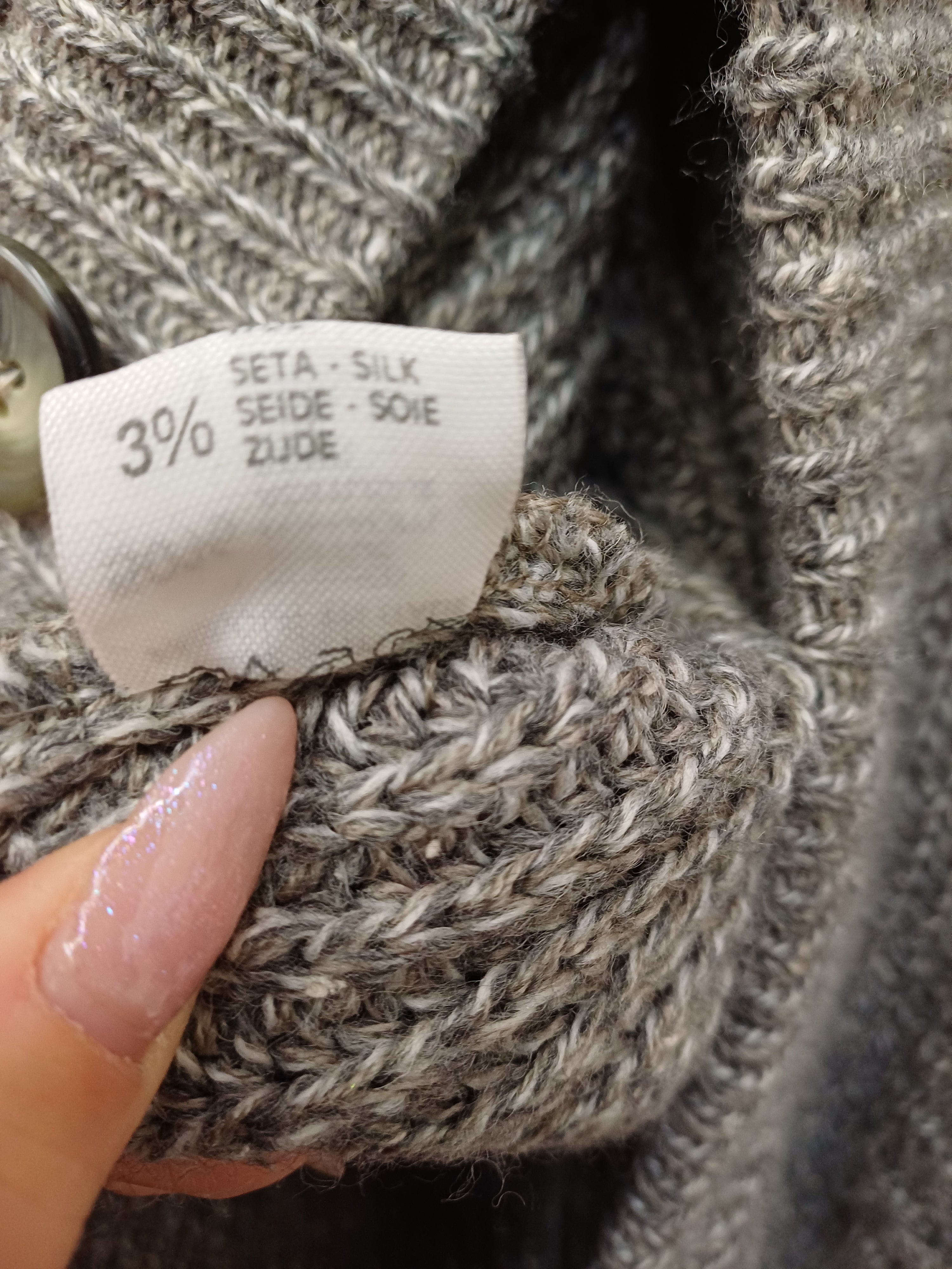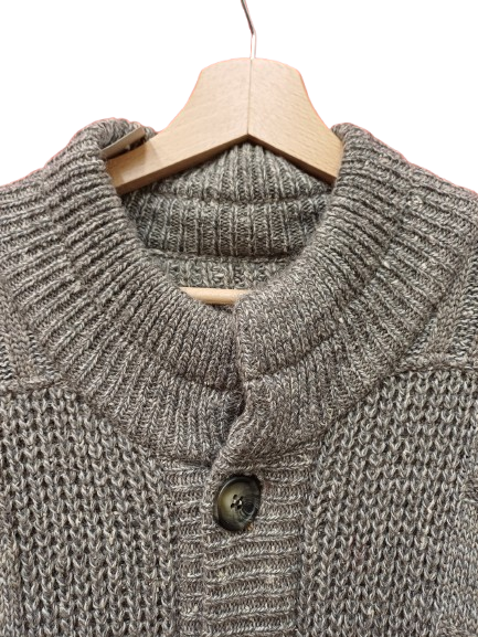 Cardigan in lana e seta, girocollo, maschile, molto ampio con lavorazione maglia molto particolare sulla spalla, taschine e vestibilità comoda, giro molto sceso tipo pipistrello. Lavare a 30gradi