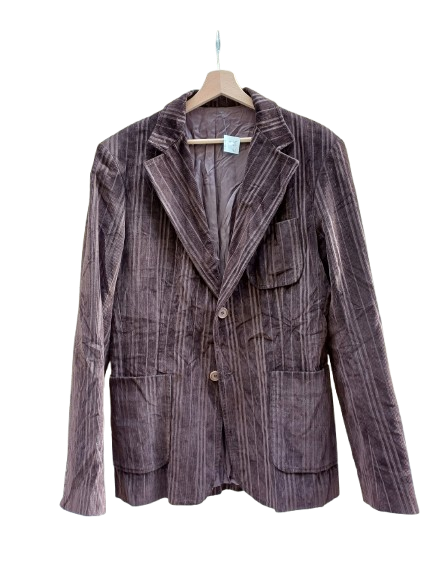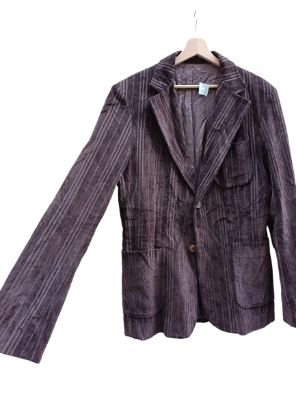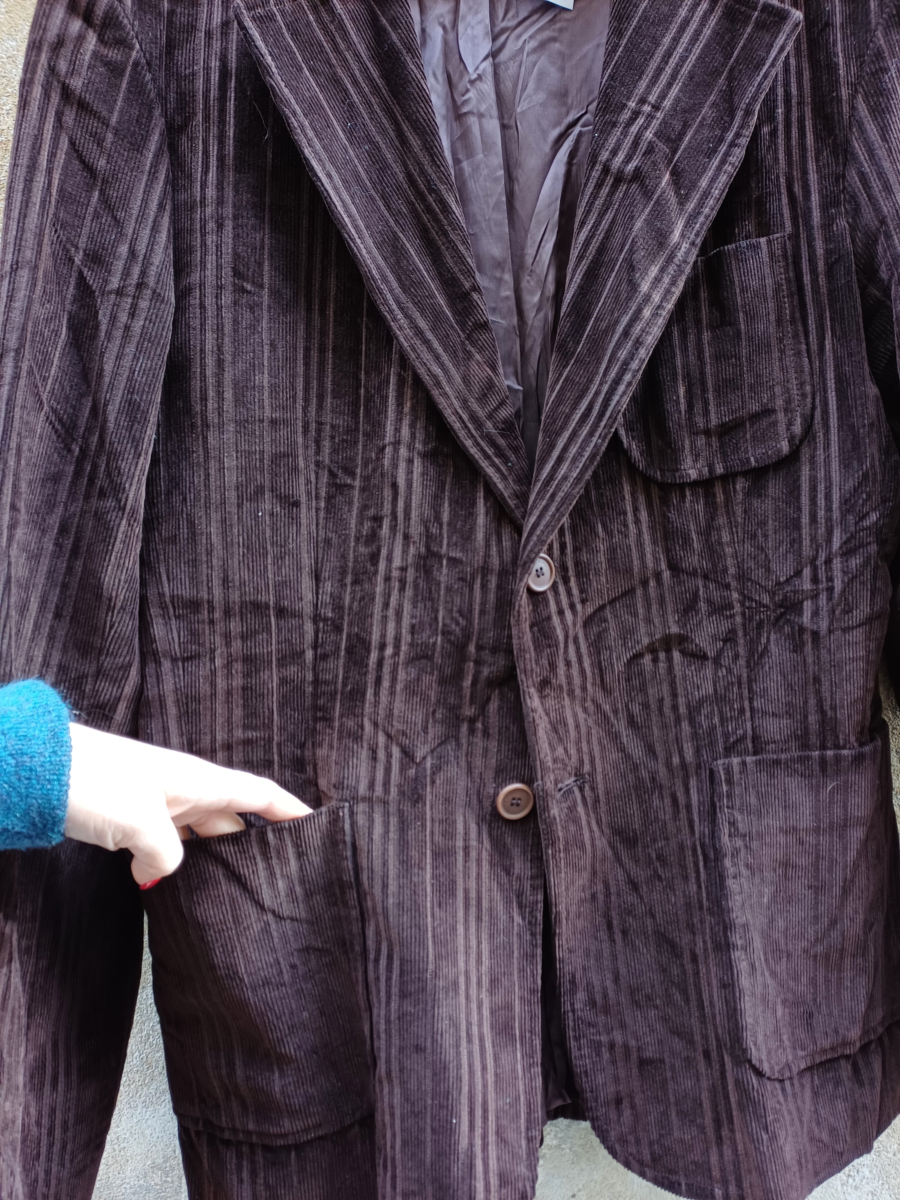 Maschile, sagomata velluto a coste irregolare, color cioccolato liquoroso,foderata probabilmente sartoriale, tasche e taglia l, un capolavoro classico oer niente noioso, ma sobrio