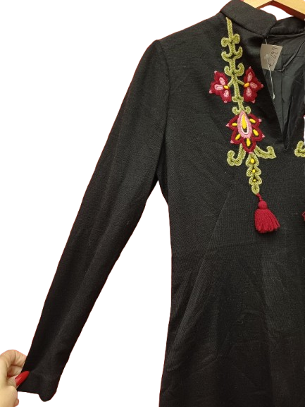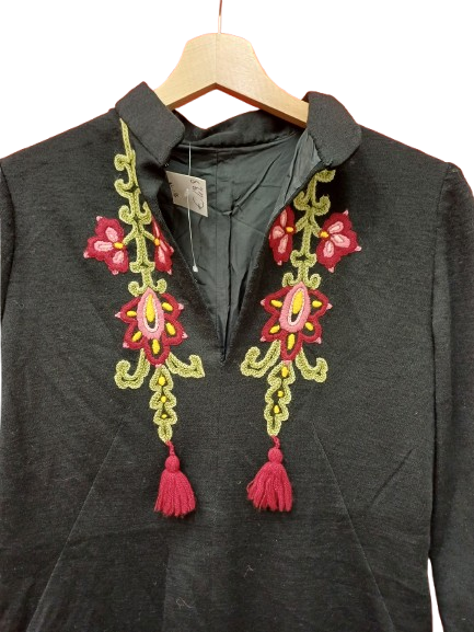 Abito in lana anni 70 taglia small , attenzione si necessitano di braccia sottili vista l' aderenza del tessuto. Non presenta zip aperture quindi anche se il corpo veste anche 44, mi sento di consigliare solo fino a 42. Sartoriale decorato floreale Tirolo.