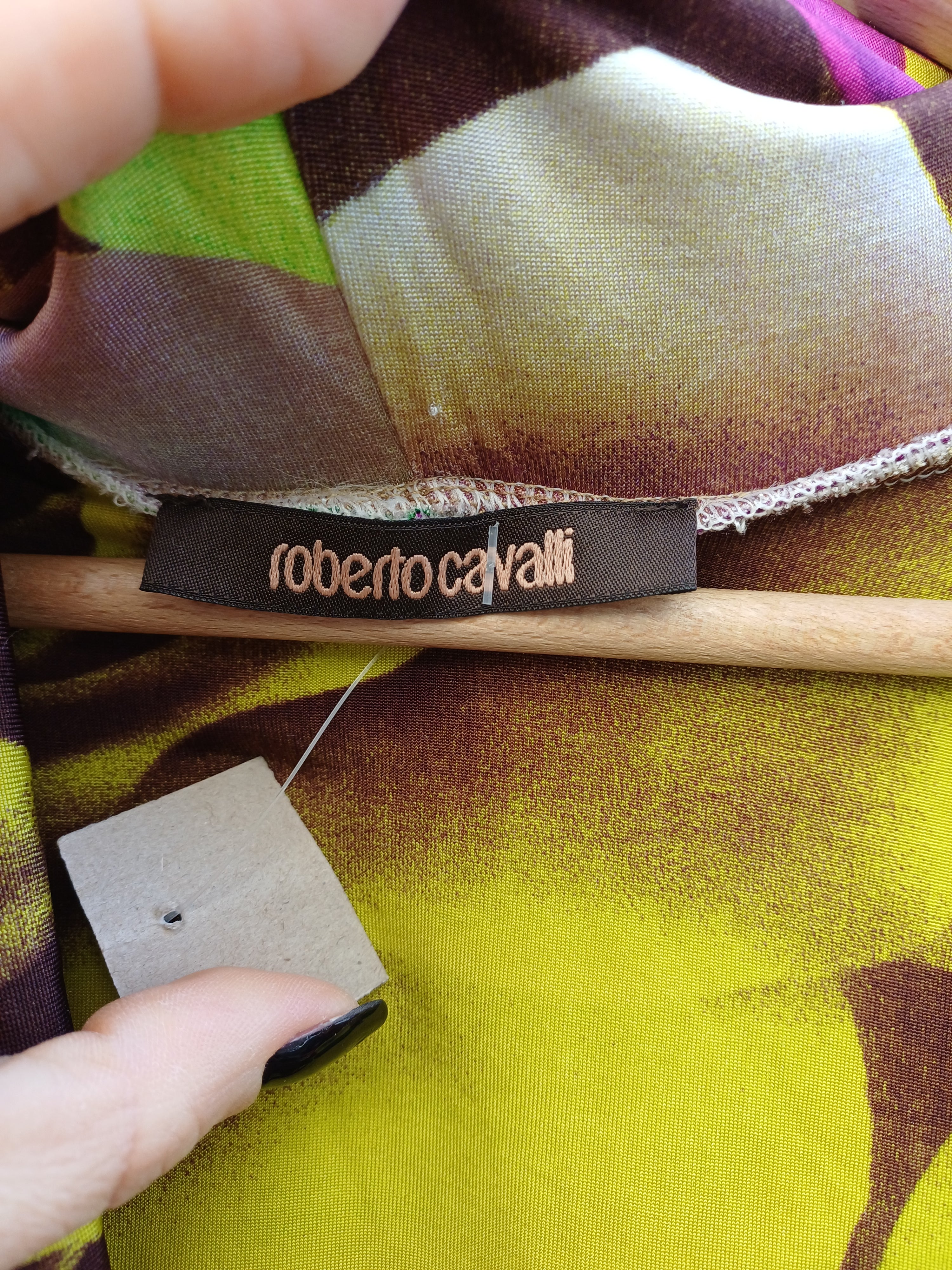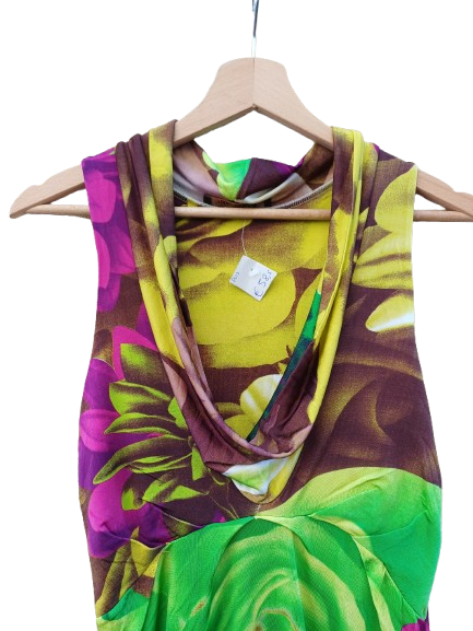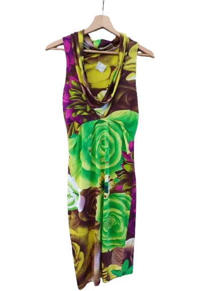 Abito in jersey di viscosa firmato cavalli, ottime condizioni con una colorazione fluo e viola , scollo a goccia, indossato veste fino la 44 comoda, rimane aderente ma non strizza, ottimo taglio con arriccio sul seno che crea un effetto impero ma allo stesso tempo non svasando ma essendo sagomato si appoggia al corpo, delineando il profilo senza costringerlo, Cavalli uno stilista italiano snobbato da molti per la sua carica seducete e chiassosa, ma amato da molti proprio per questo anti silenzio, una cerimonia, una pizza con le amiche qui la direzione la detta la scarpa e gli accessori e soprattutto la propria intenzione