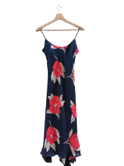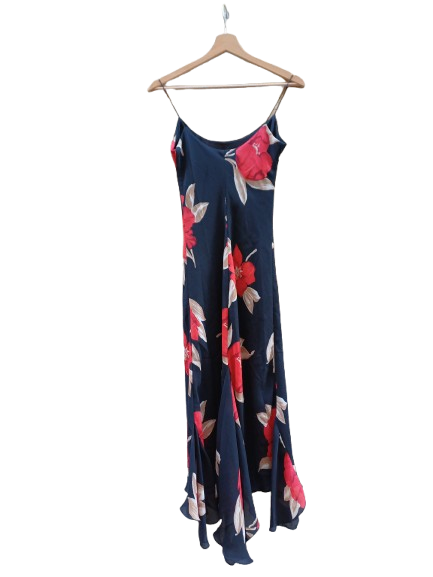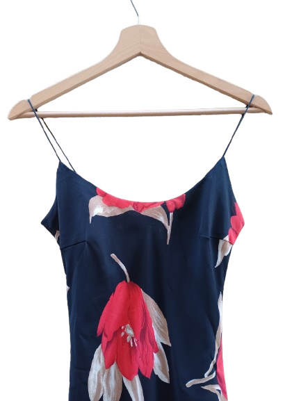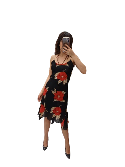 Anni 90, fodera in polyester, fantasia floreale su fondo nero, spalline sottili, taglio i tralice non segna ma avvolge, taglia small massimo 42, abbinabile sia a look casual da giorno sia d'estate che di inverno con anfibi e maglioncioni neri, texani o tacchi a spillo questo vestito è camaleontico e si adatta a tutte le esigenze, si asciuga in fretta e dietro presenta una codina tipo strascico che lo rende più dinamico e particolare