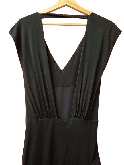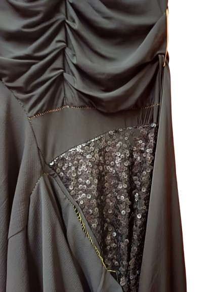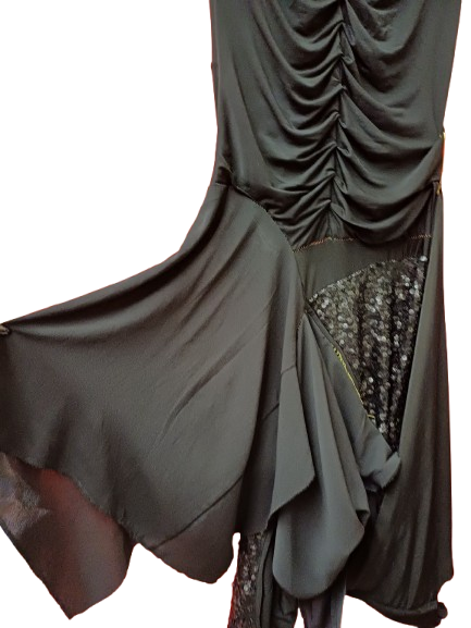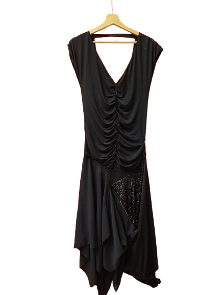Abito fatto di mille neri, paillettes opache e tagli in sbieco, con cuciture fluo a vista per accetuare l'esperienza punk