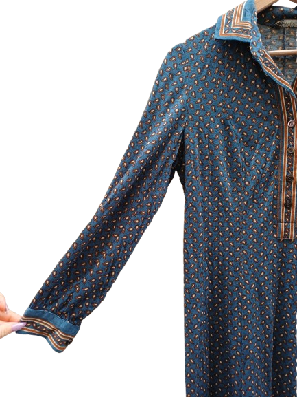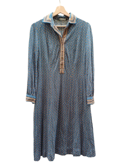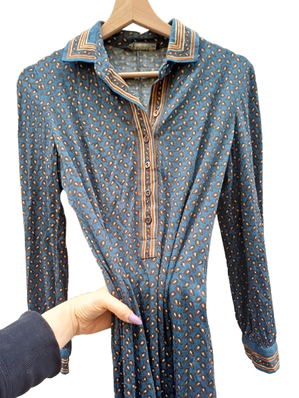 Abitino in jersey, con fantasia folk su fondo carta da zucchero, taglia 48, ma grazie alla stoffa scivolosa e il taglio dritto si presta a cintoline che segnano il punto vita, si porta bene anche a gamba nuda con mocassini e calzettoni a vista