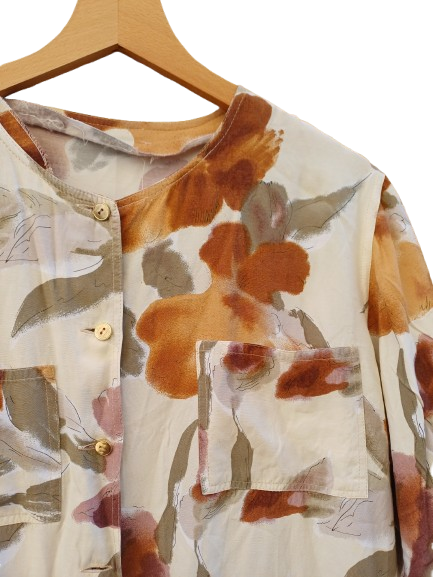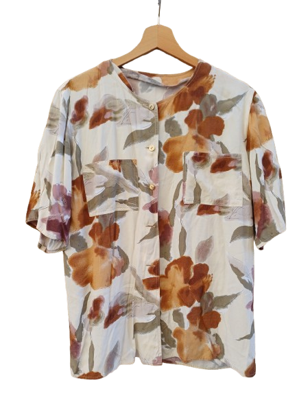 Semplicità freschezza e tepore del colore sono le parole chiave di questa camicetta sartoriale, classicissima ma dolce e salata, fit dritto e ampio, manica corta e girocollo, taschine davanti sul seno, viscosa e bottoncini originali, anni 80 90, un pezzo da indossare sempre sopra pantaloni corti o ampi in lino o denim, perfetta sopra vestitino bucolici o costumi per le più marittime, un pass par tout che si potrebbe aver rubato alla nonna ma che forse ce lo ruberà proprio lei