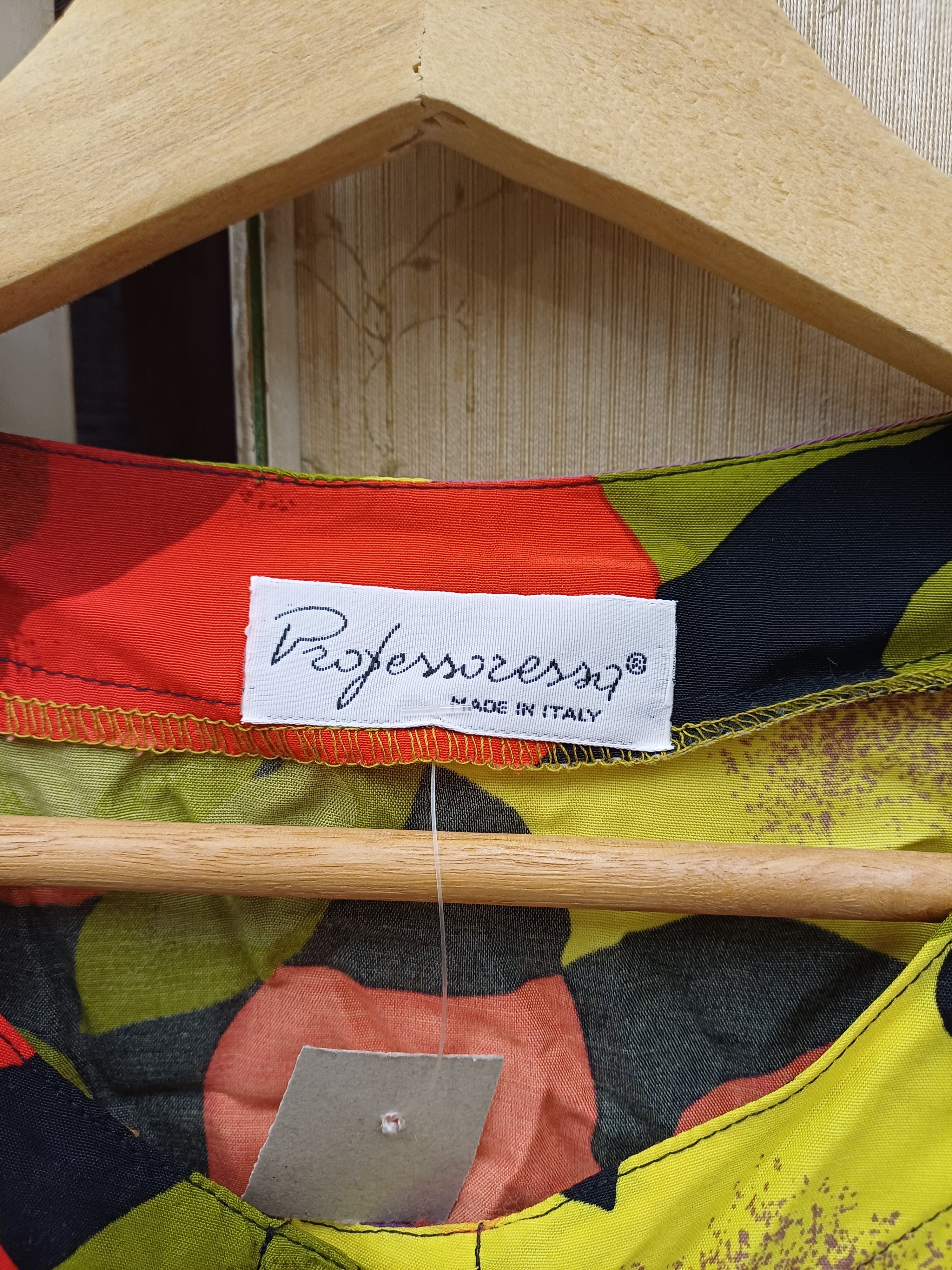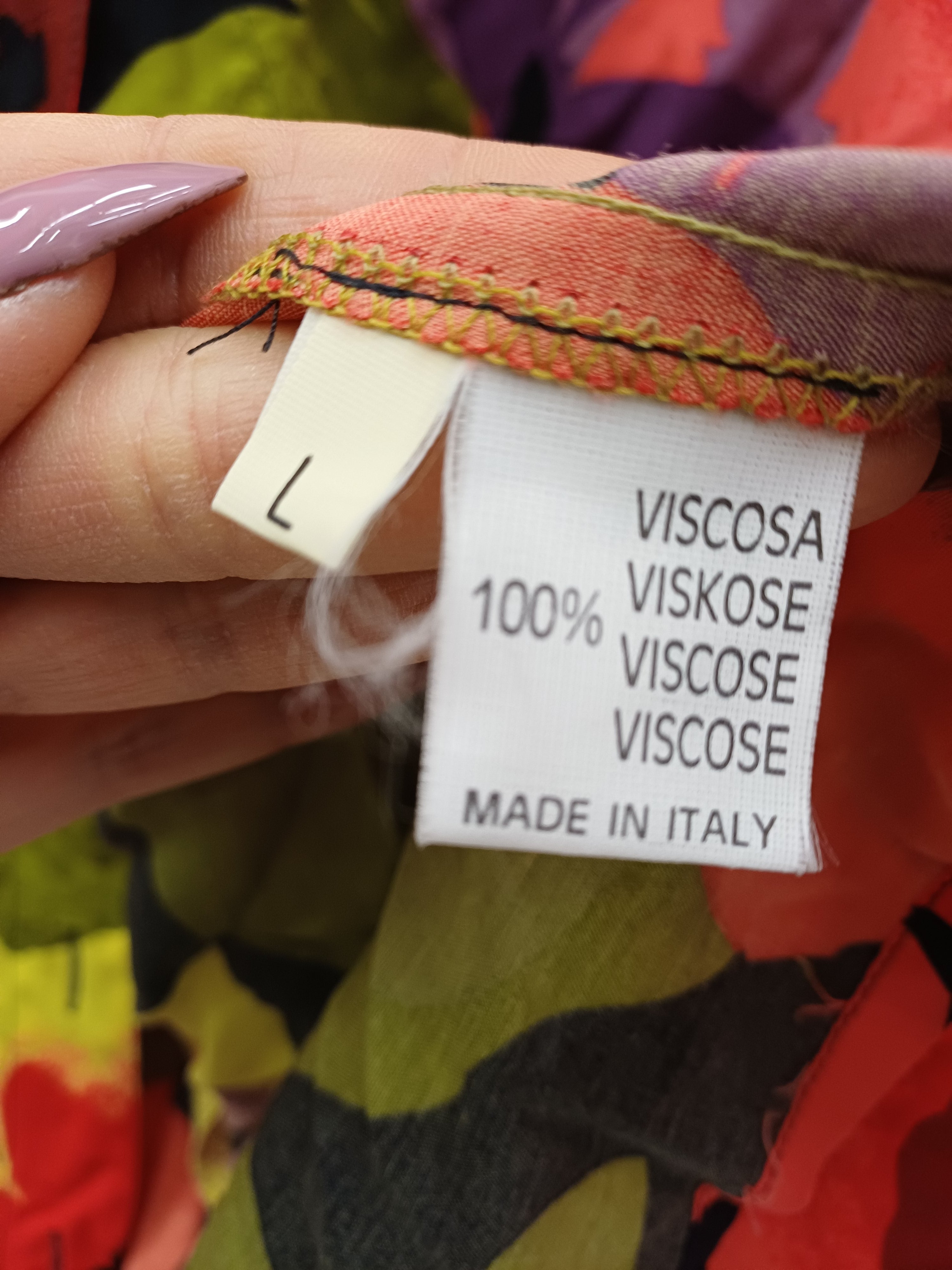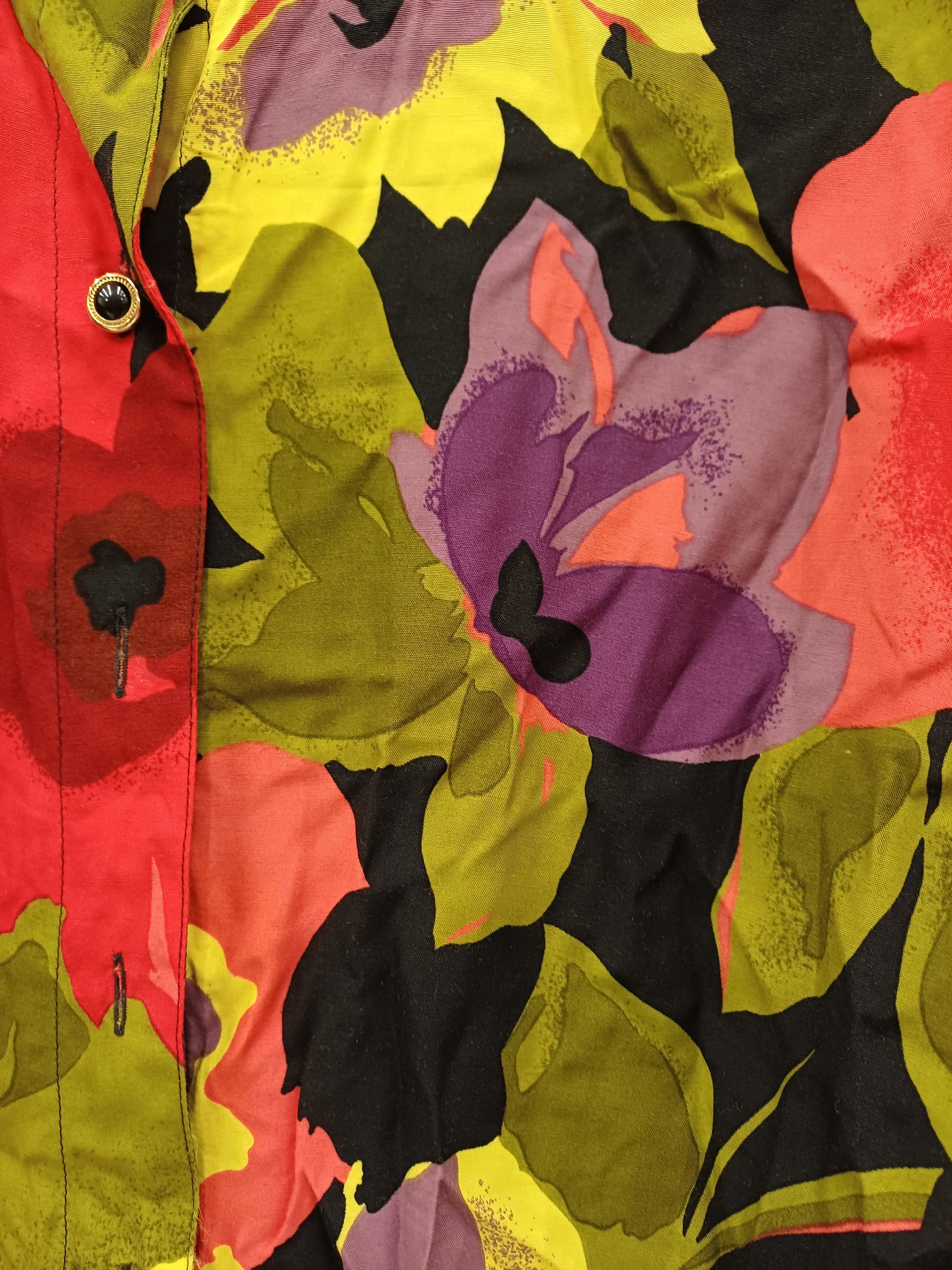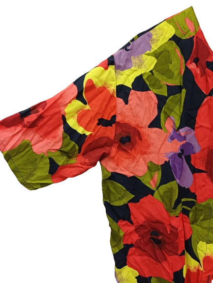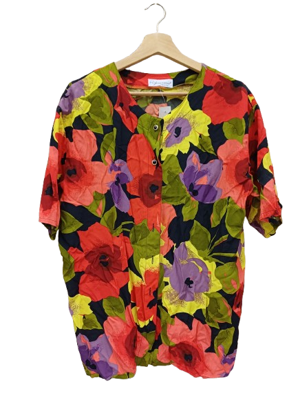 Capo comodo e versatile, ottime condizioni, colori accesi ma non squillanti, fiori stilizzati, e bottoncini ancora originali, girocollo e manica ampia veste xl 100% viscosa leggera e fresca anche da portare aperta