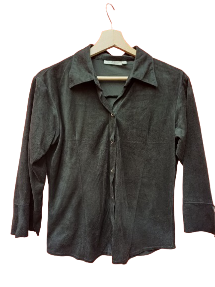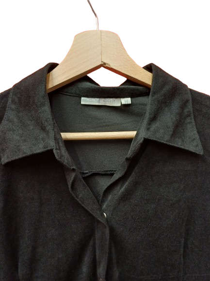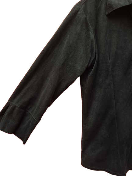 Camicia in 100% poly che sembra velluto liscio o camoscio, elasticizzata, nera, con bottoni a scatto sueper sexy anni 00, minimalissima con manica a 3/4 e spacchetto, sciancrata, rimane aderente ma non strizza, un gingillino per l'ufficio o per scaldare abitini senza spalline facendo quasi da giacchino corto primaverile, un must have per chi ama i look semplici ma di effetto veste una large comoda