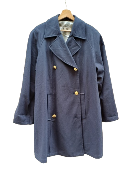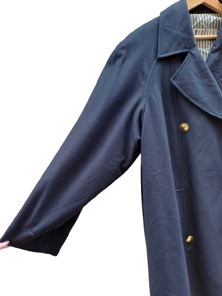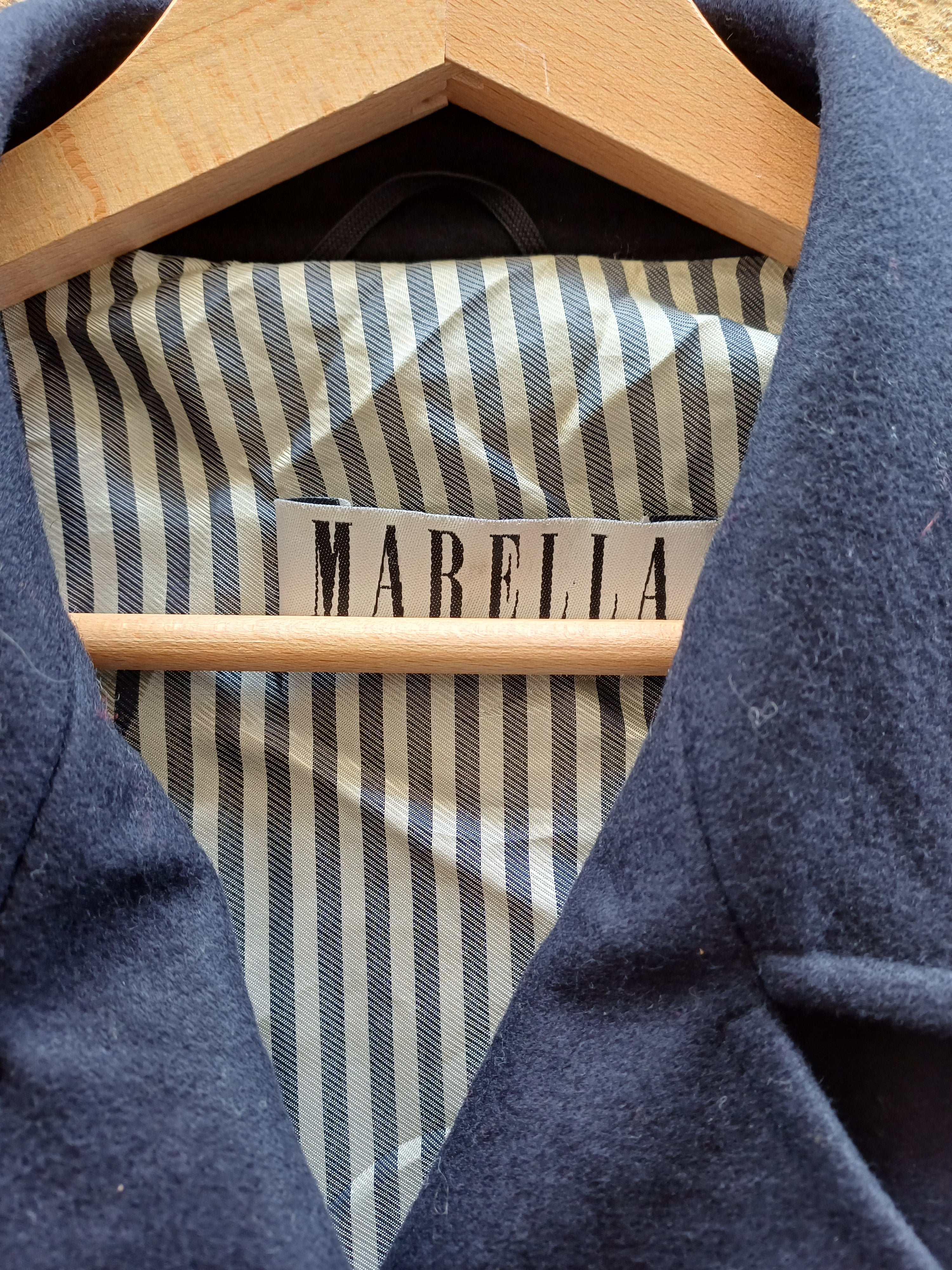 Cappotto da mezza stagione firmato Marella in lana e fodera in acetato a righe che ricorda un po' le domenica alle prime soline di mare, bella con look di denim bianchi o pantaloni classici beige e jeans semplici, un capo classico da sdrammatizzare con colori corallo, gialli e verdi smeraldo, un pezzone iconico e must have con la manica raglan e la spallina leggermente rinforzata, tasche diagonali, doppio petto gli manca un bottone al centro