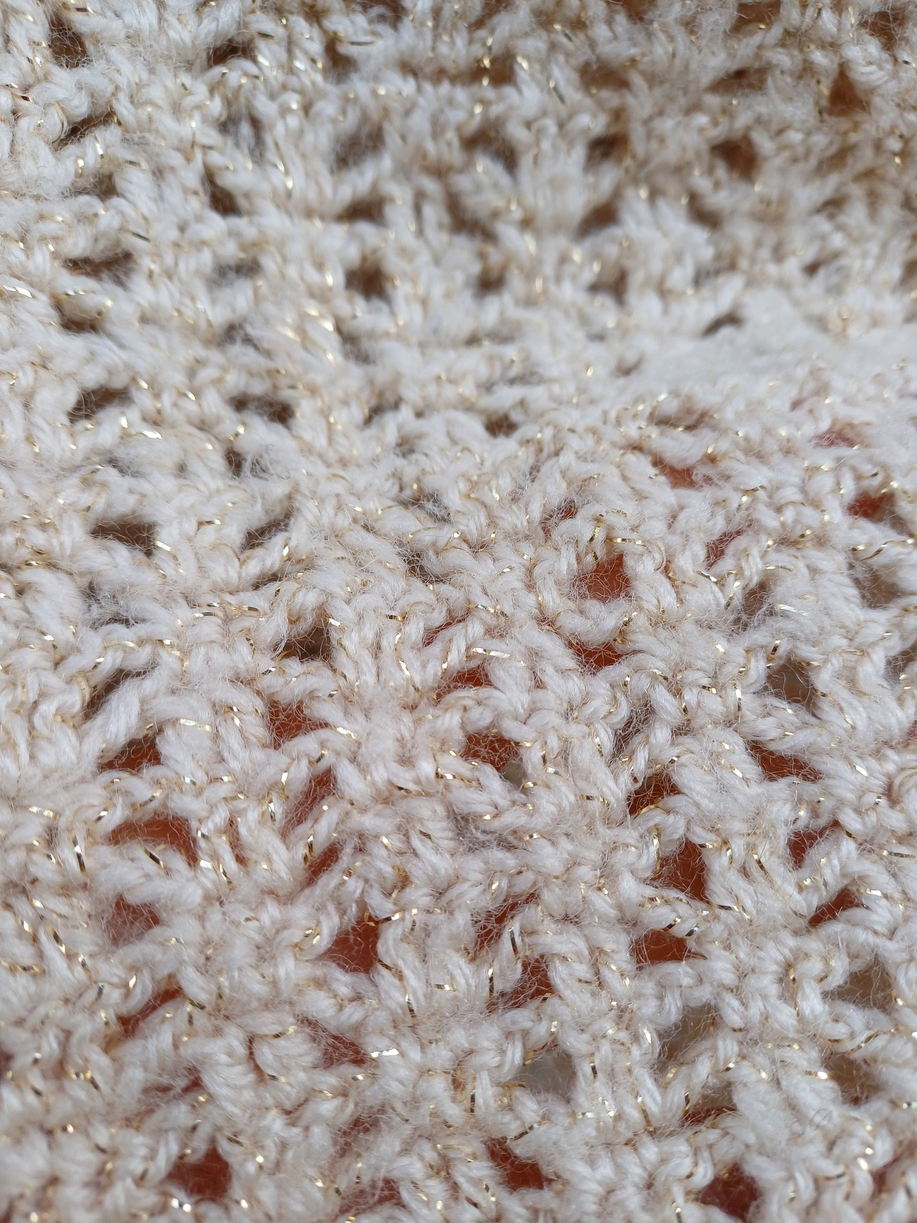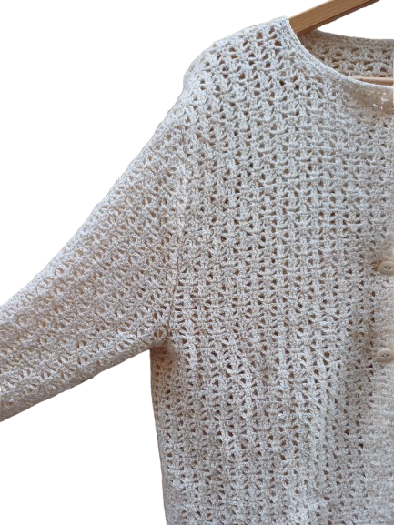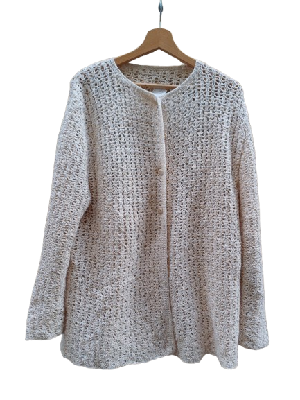 Cardigan panna con filo lurex oro, girocollo taglia 46 accomoda, maglia larga probabilmente fatto in casa, semplice e delizioso da abbinare a sottoveste e sdrammatizzare con texani oppure si jeans in primavera