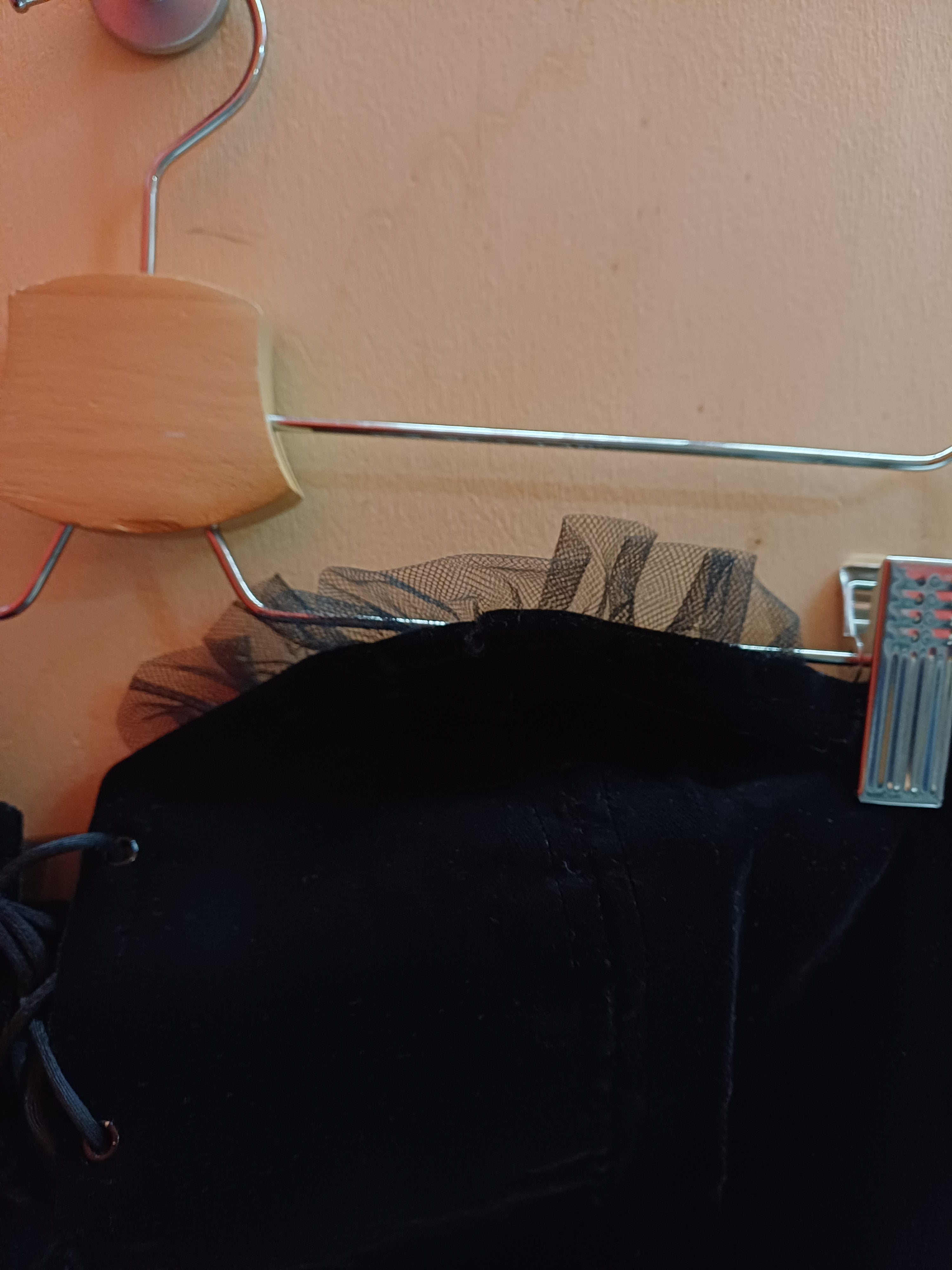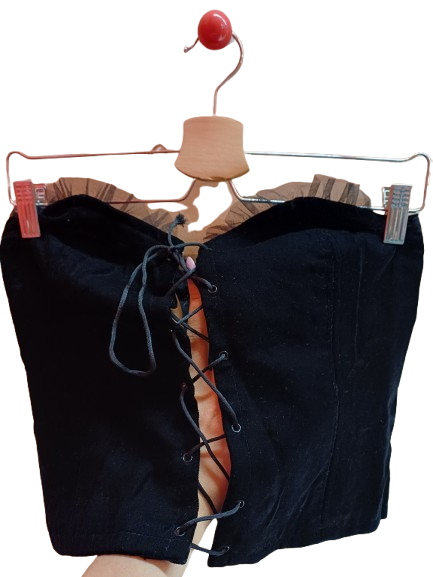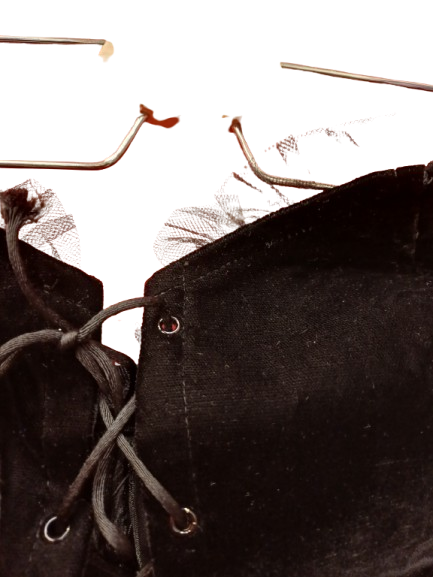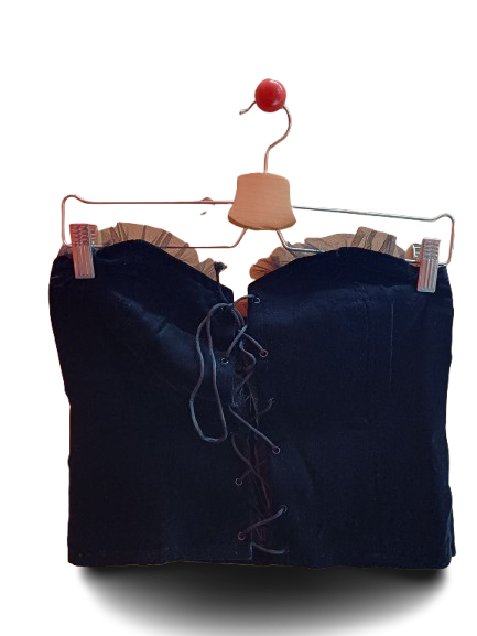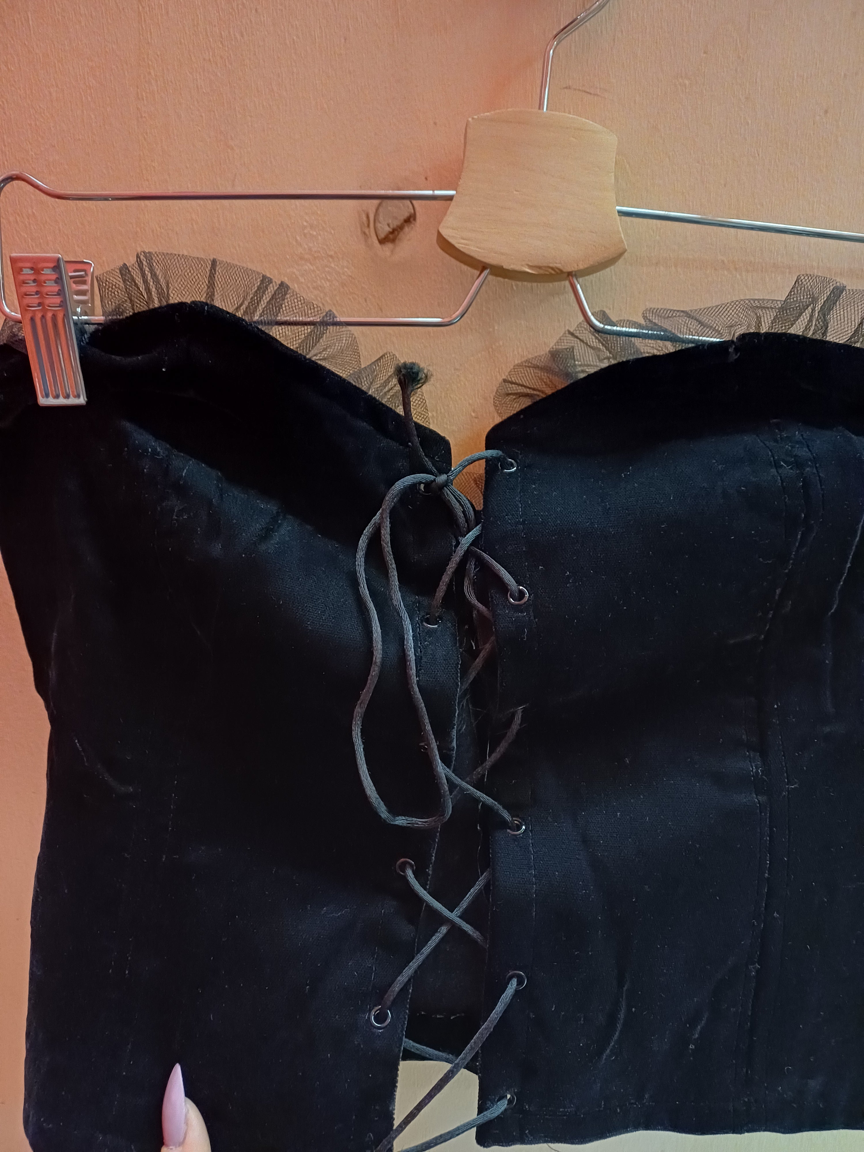 Corsetto in velluto e tulle nero, allacciato davanti ad incrocio, sartoriale, sagomato ovviamente regolabile ma non veste più di una terza, una delizia che arricchir ogni outfit basic dal gotico al coquette bello anche con sotto una camicia a pois o bianca questo capo può fare anche da accessorio per definire la vibrazione del look