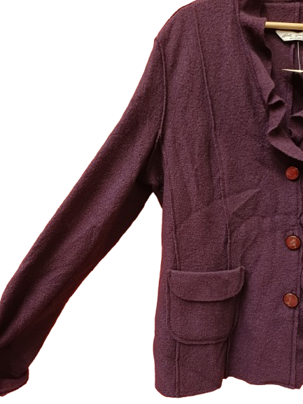 Il colore più preciso è il viola della seconda foto, cher mostra il colletto, particolarissimo a rouches, giacca in q09% lana cotta con cuciture finto rovescio e bottoni originali firmata Giulia Galanti,  come nuova veste una 48
