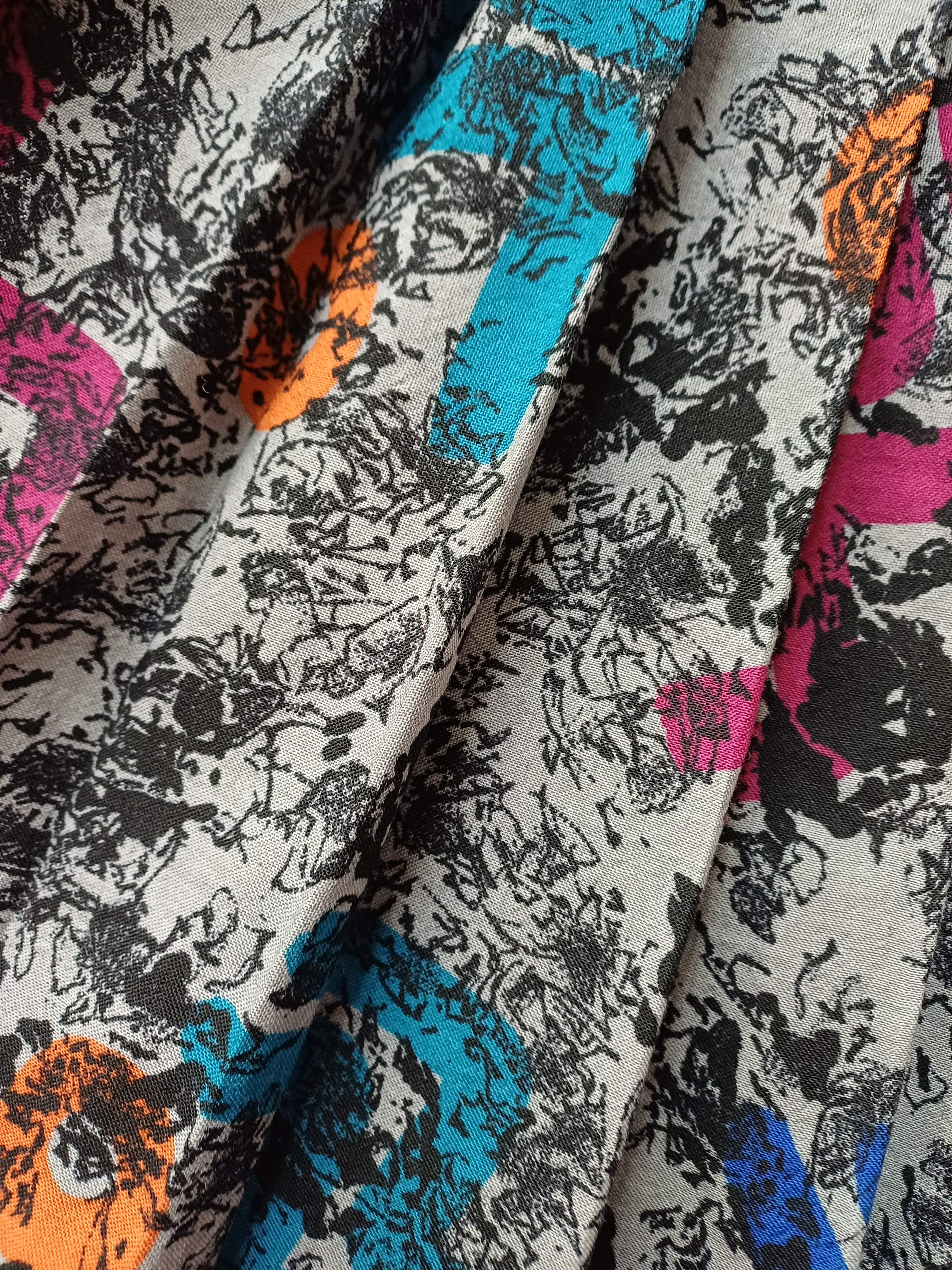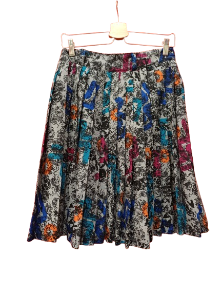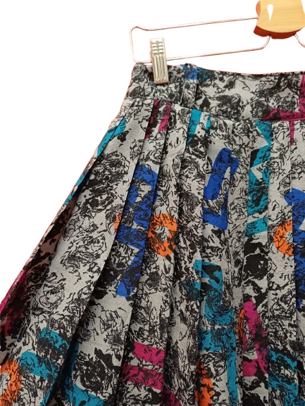 Capo sartoriale, in lanetta, gonna a pieghe, foderata, comodissima e casual, portabile 3 stagioni l'anno, cinturino alto, fantasia geometrica con colori stile in negativo multicolor su fondo grigio e nero, bella con anfibi, tennis, e texani