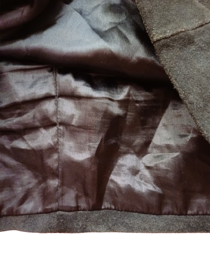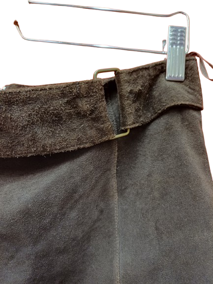 camoscio con finta cintura solo sul davanti , leggermente elasticizzata, marrone cioccolato fondente caldo, taglia media, bella sia di autunno inverno che in primavera, con texani o sandali zeppati con inserti in legno, carina pure con anfibi o mocassini