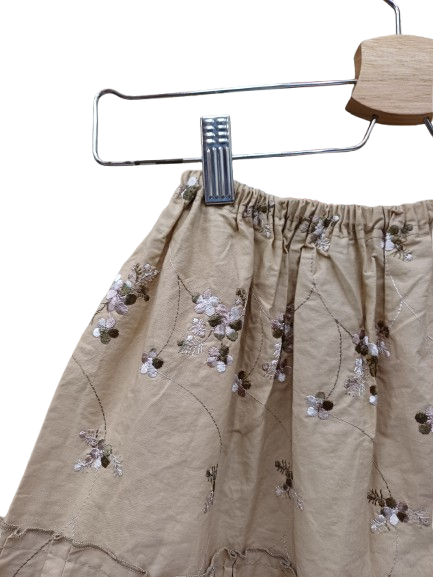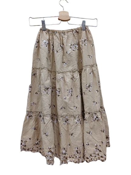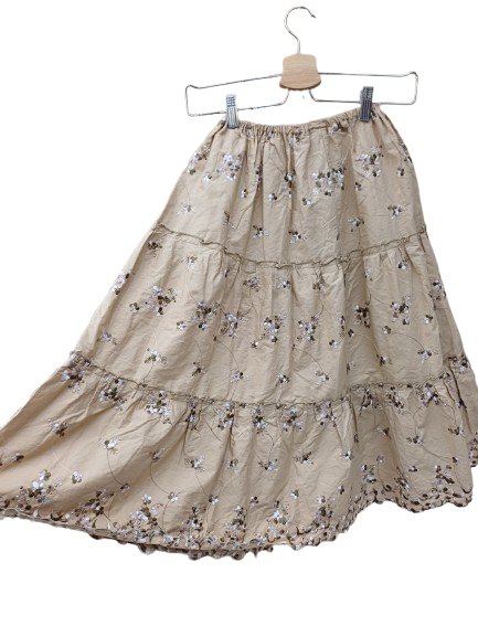 Gonna in cotone tanto semplice quando mettibile, da una cerimonia informale ad un viaggio avventuroso, beige elastico in vita, non presenta segni di usura, ricami floreali e balze, molto anni 90 sta bene con tacchi, espadrillas texani ciabattine e tennis