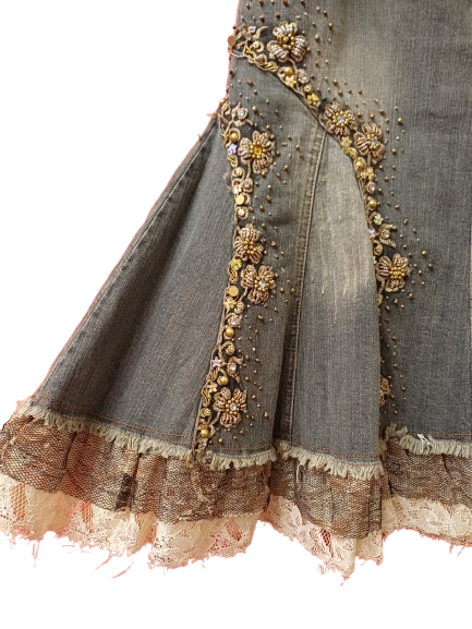 Gonna taglia 42, senza stagione in denim con applicazioni e passamanerie,  a spicchi un capo iconico anni.00 mettibile 4 stagioni l'anno anche per cerimonie informali