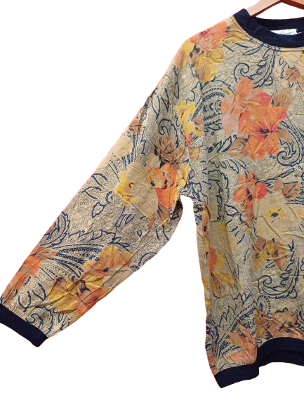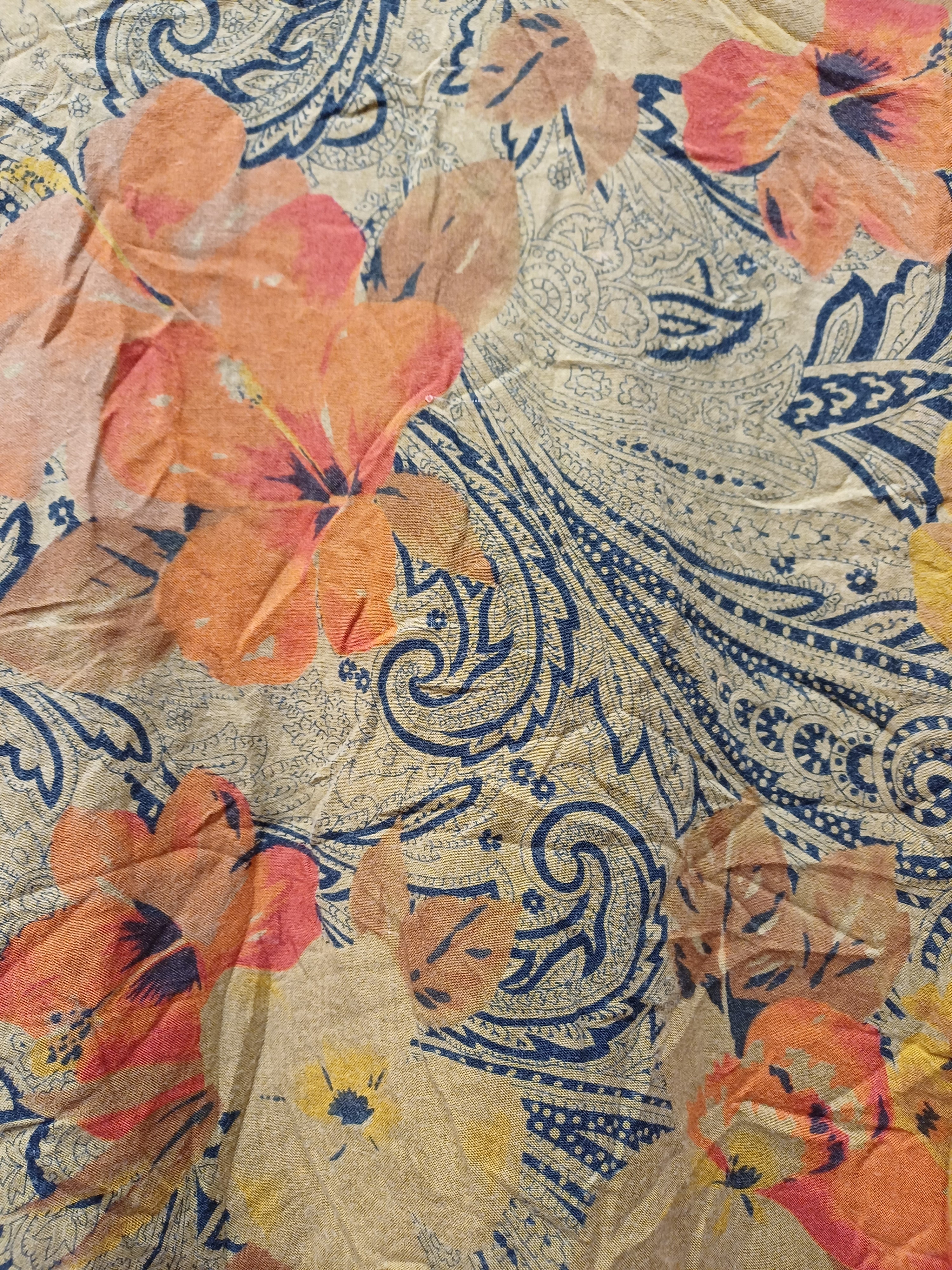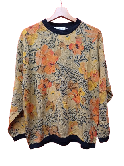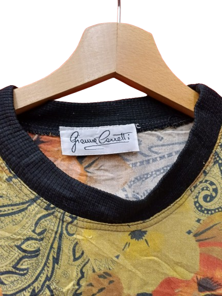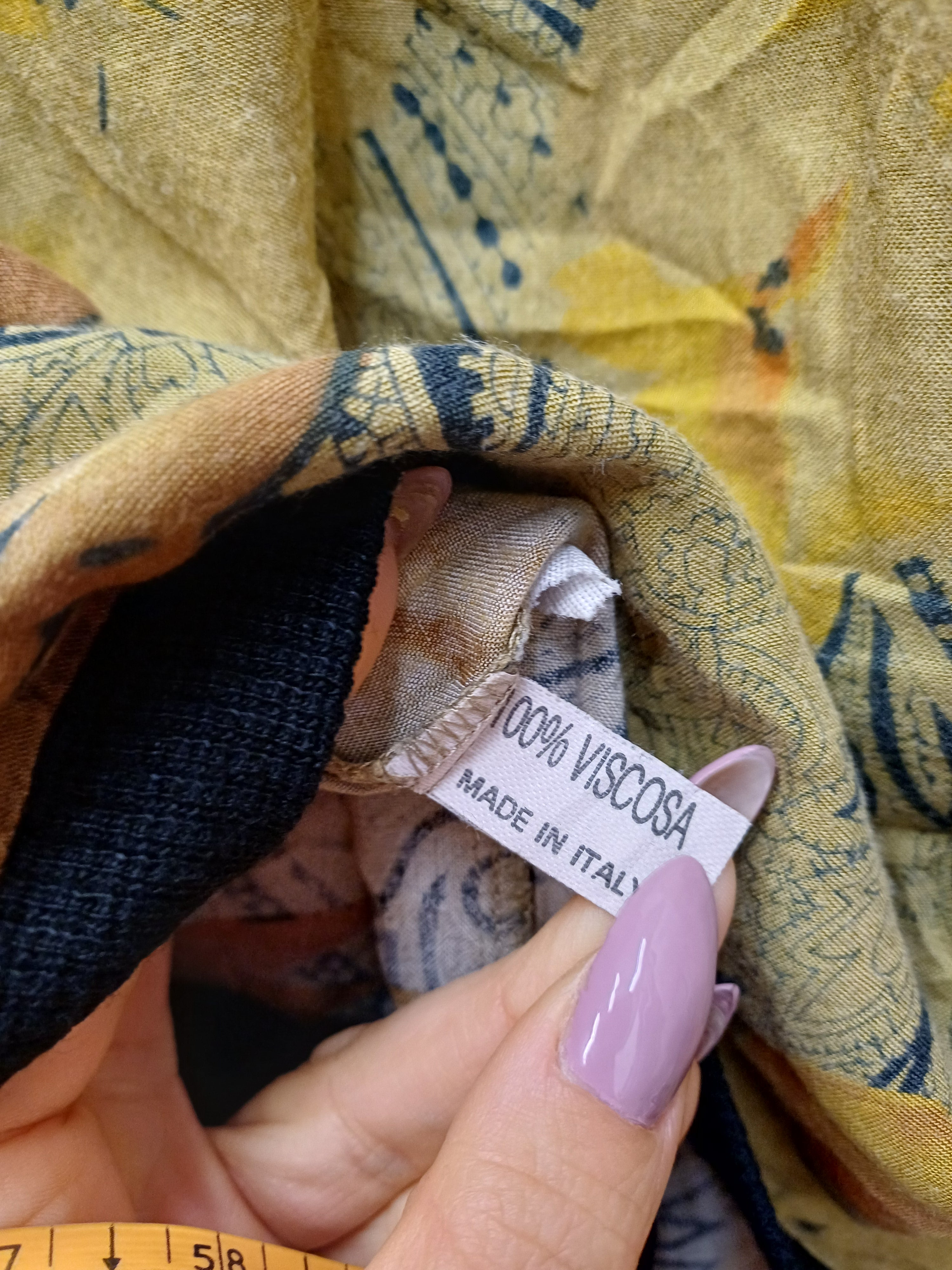 Apparentemente semplice questa maglia in viscosa può essere usata in diversi modi per tutte e 4 stagioni, costurini in maglia, tessuto in viscosa e fantasia hawaii, danno una sensazione criptica e per nulla scontata ad un oggetto utile, comodo versatile, bella anche su bermuda in cotone sostenuto o a pantaloni un po' giapponesati larghi e rigidi sta benissimo anche su gonne in denim o pizzo