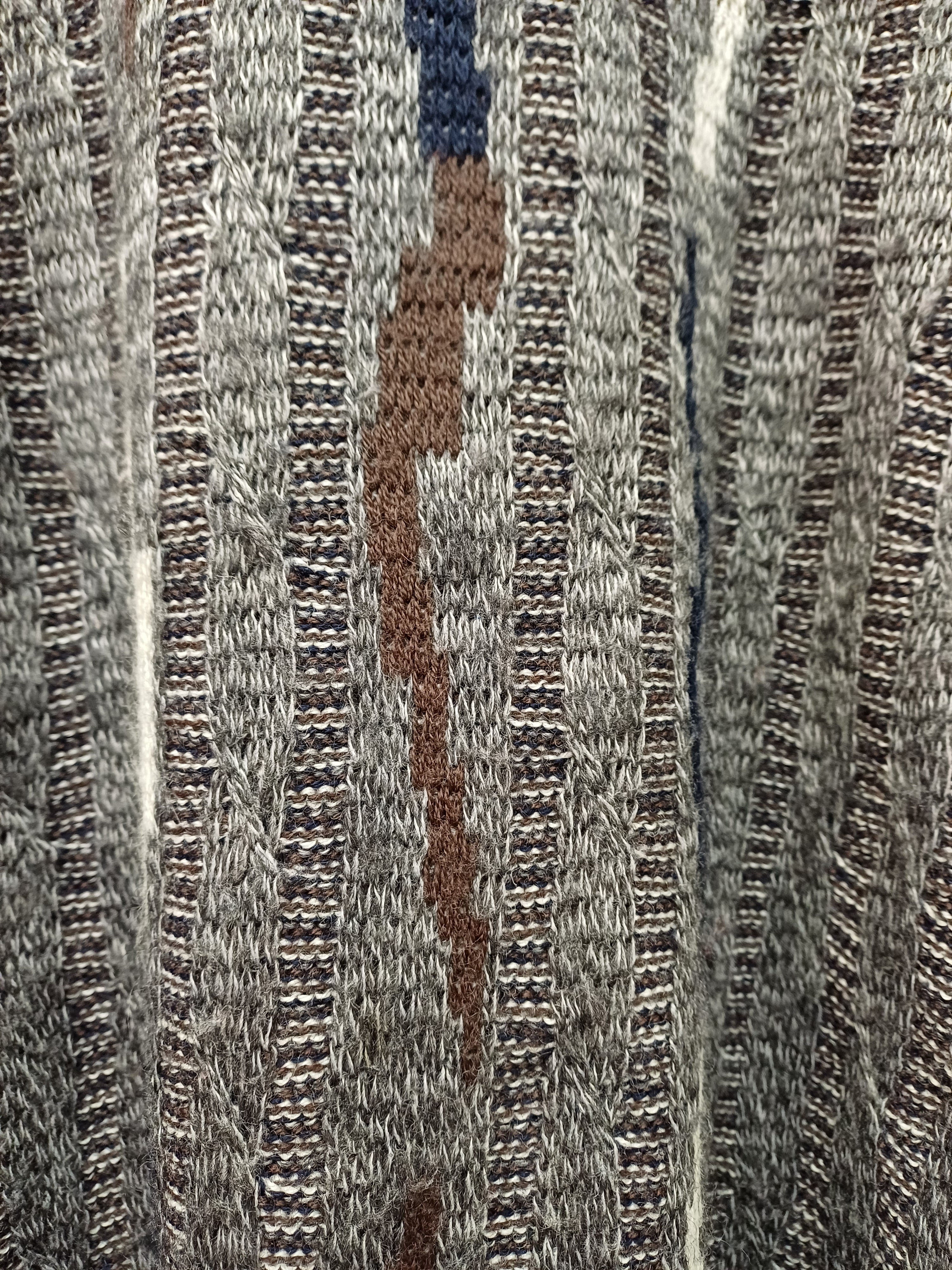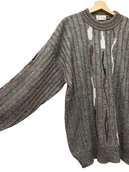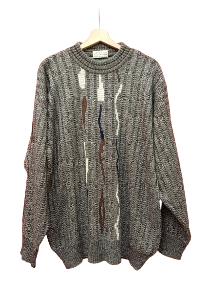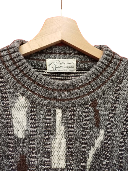 Maglione maschile, grigio melange,  girocollo con disegni geometrici verticali sul marrone panna e blu, anni 90 vestibilità comoda ma non over misto lana