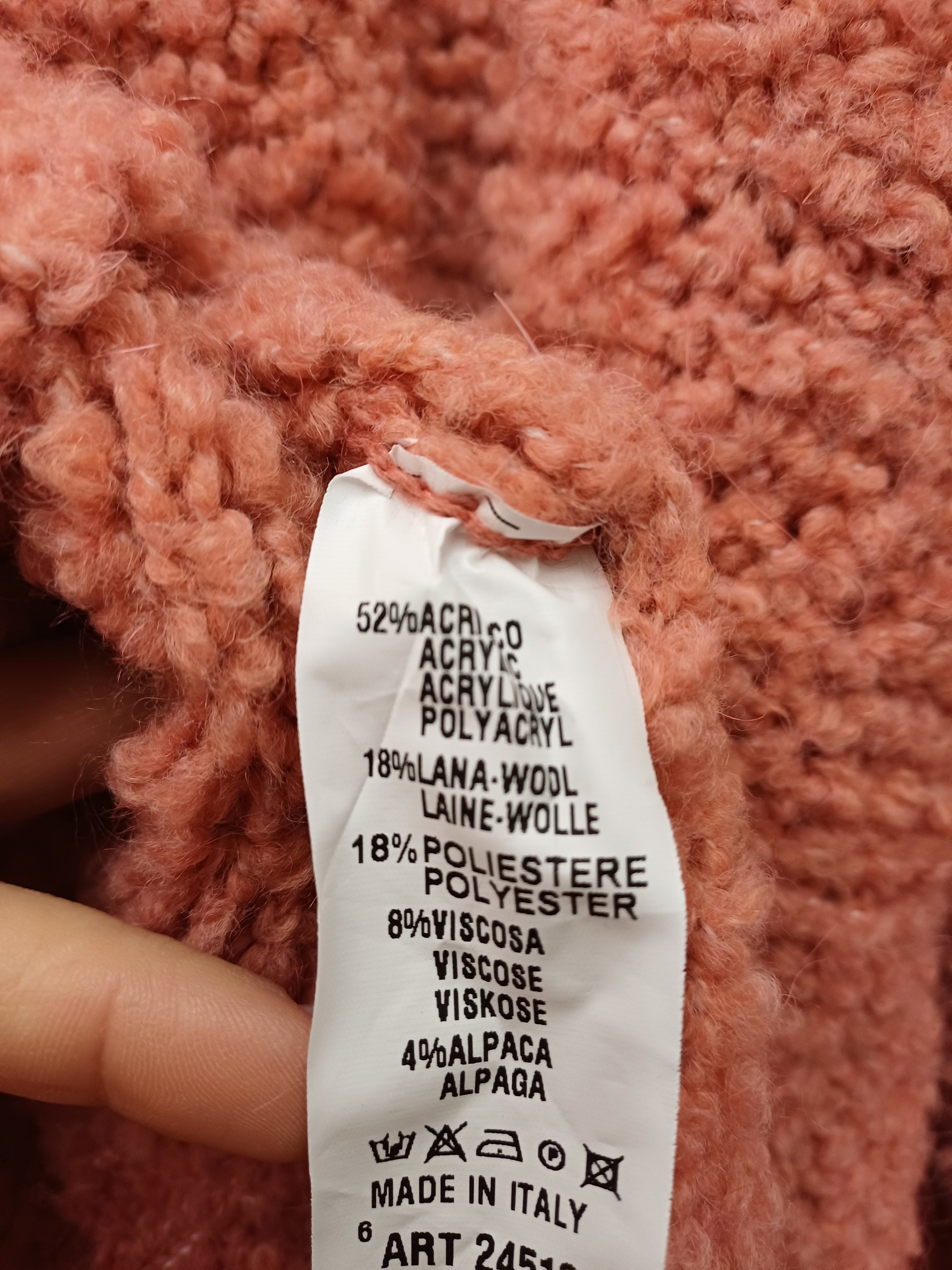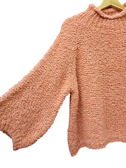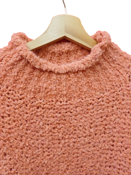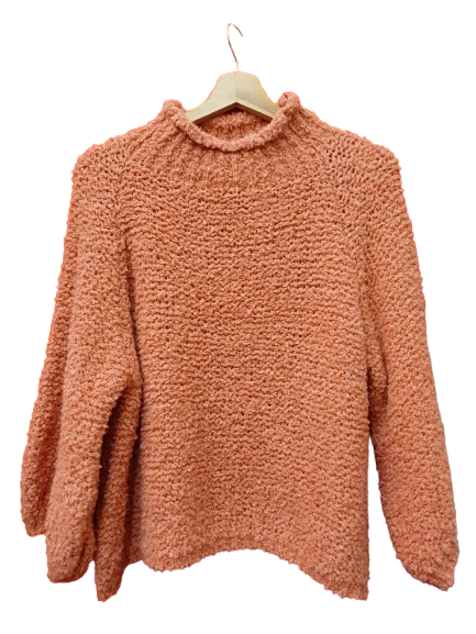 Maglia nuova calda color salmone, mezzo collo filato tridimensionale che da morbidezza e fantasia as in modello abbastanza minimal nel taglio, manica ampia leggermente più corta rispetto ad una manica lunga classica per far uscire polsini di camicetta o magliette, giro raglan e fit quadrato.