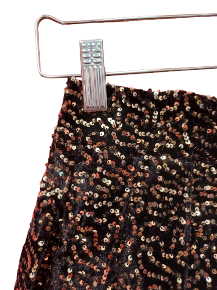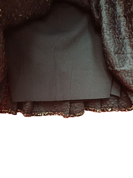 Gonna con pantaloncino.sotto, in belluto nero e paillettes oro, elastico in vita a piegoni, veste s/m rimane corta ma essendo invernale richiede una calza coprente, sempre ottima per look sbarazzini da sera