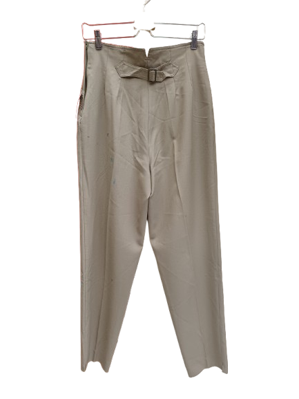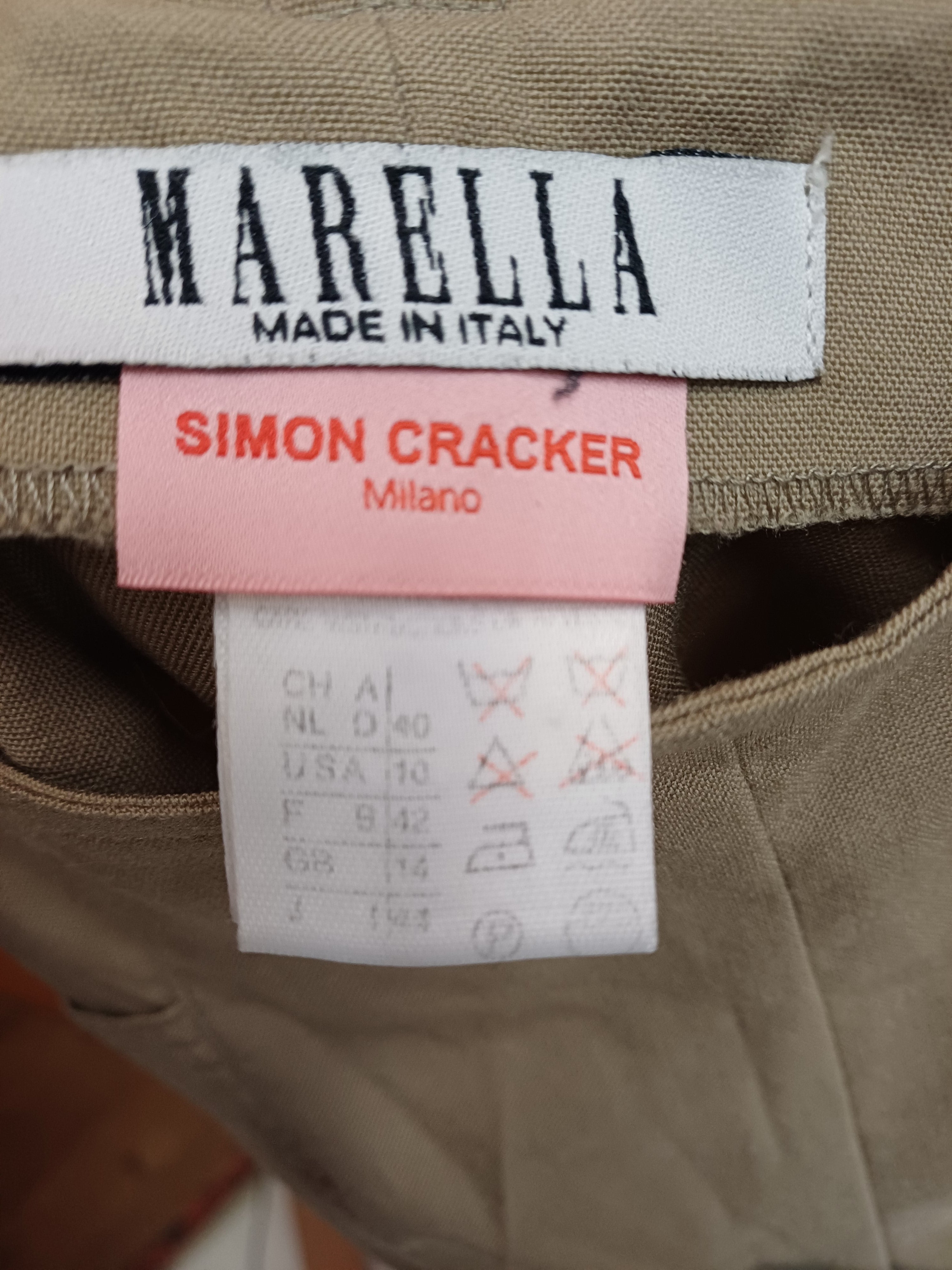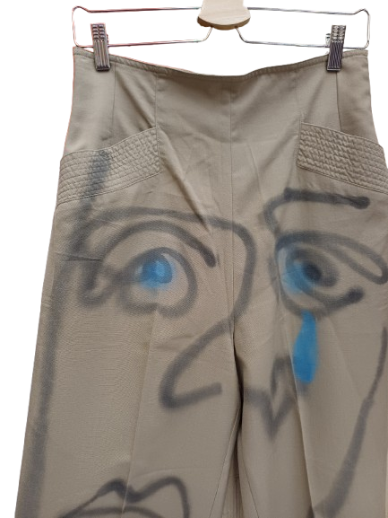 Pantaloni upcycling by Simon Cracker, in lana firmati Marella, sopra c'è il disegno riconoscibilissimo di Simon, vita alta, tornano benissimo taglia 42 stretti in fondo molto anni 00